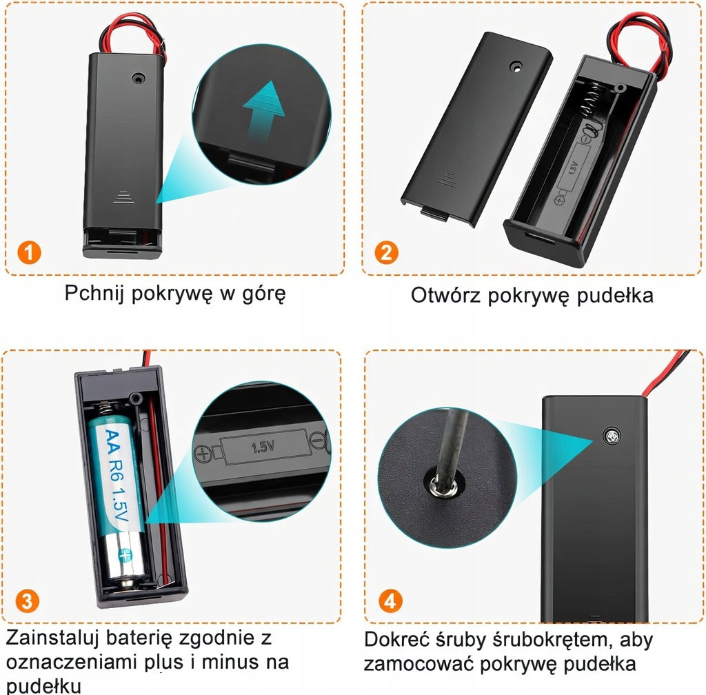 Pakiet zawiera: 6 sztuk koszyków na 1/2/3/4 baterie AA z pokrywką i przełącznikiem, 2 sztuki plastikowego pudełka do przechowywania baterii, 6 sztuk śrub, 1 śrubokręt.