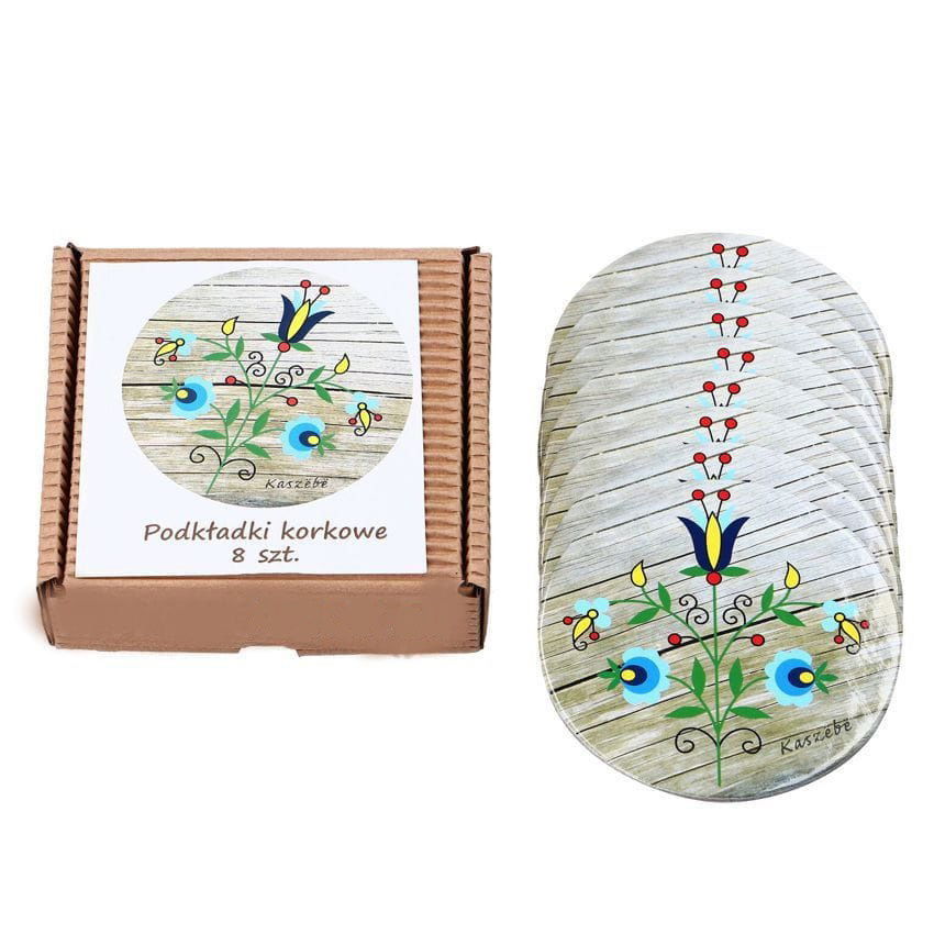 8 sztuk podkładek pod kubki i szklanki - na ludowo. Na podkładkach znajdują się elementy haftu kaszubskiego szkoły żukowskiej. Wykonane są z korka oraz tektury. Zestaw zapakowany w kartonowe pudełko. Średnica: 9 cm