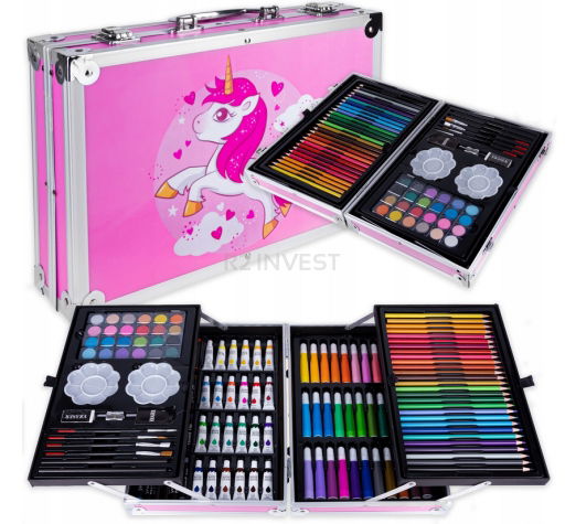 Odkryj nieskończone możliwości twórczej zabawy dzięki naszemu zestawowi artystycznemu! Zawiera 145 elementów, w tym farby akwarelowe i akrylowe, pędzle różnych rozmiarów, kredki, pisaki i wiele innych, wszystko w praktycznej walizce w kształcie jednorożca.