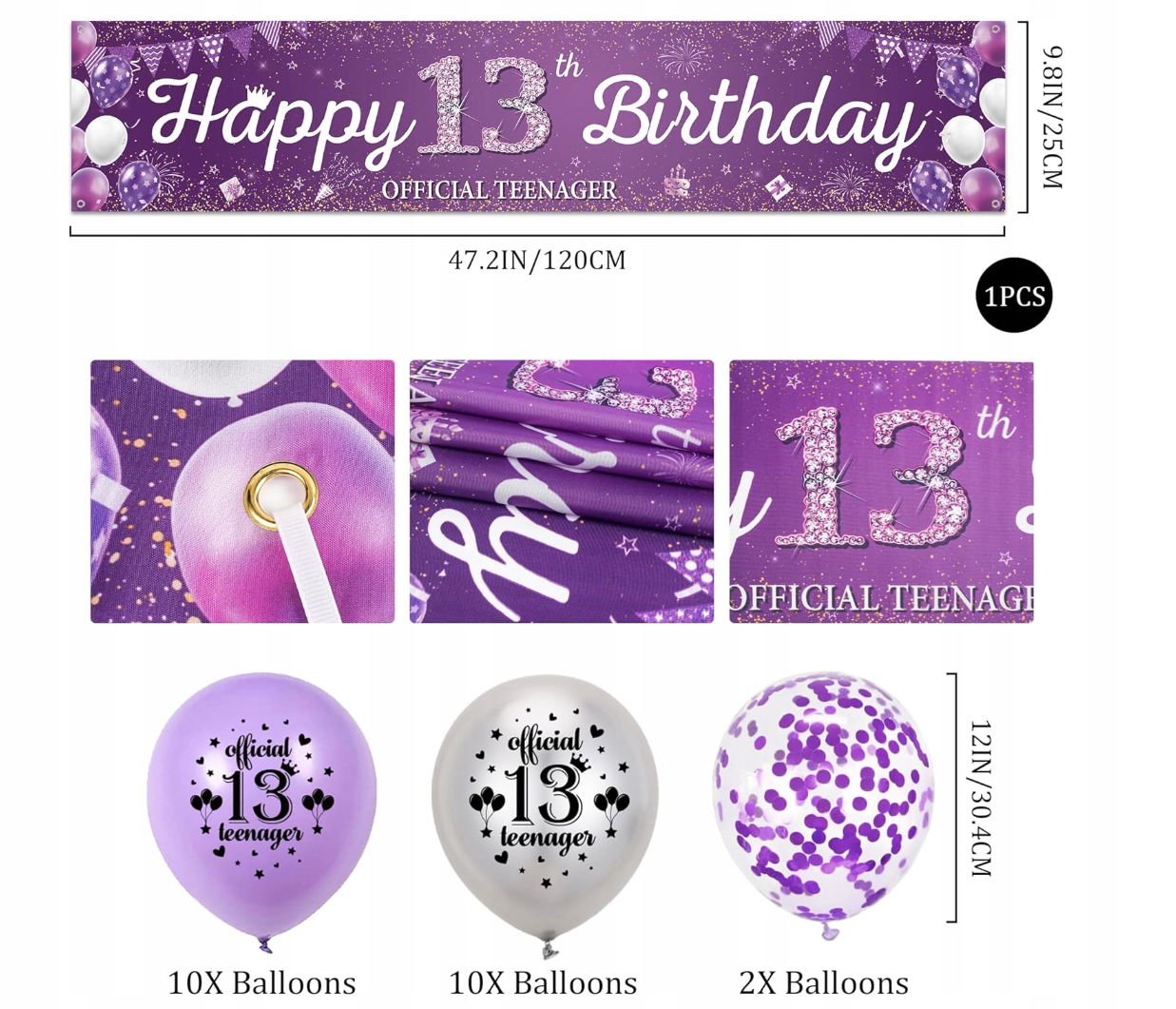 - ✴️ Przyciągający wzrok, duży baner – Duży fioletowy baner o wymiarach 25 × 120 cm z napisem „Wszystkiego najlepszego z okazji 13. urodzin” wyróżnia się żywymi kolorami i atrakcyjnym wzornictwem. Nadaje się do użytku wewnątrz i na zewnątrz, tworząc harmonijną, radosną atmosferę.