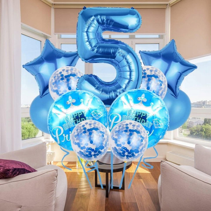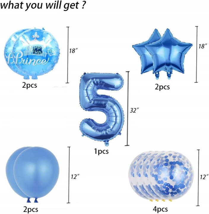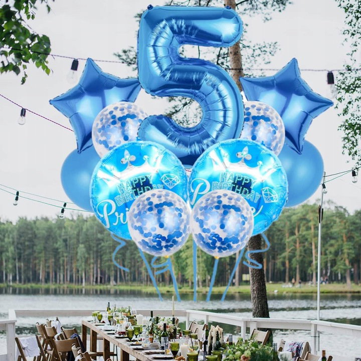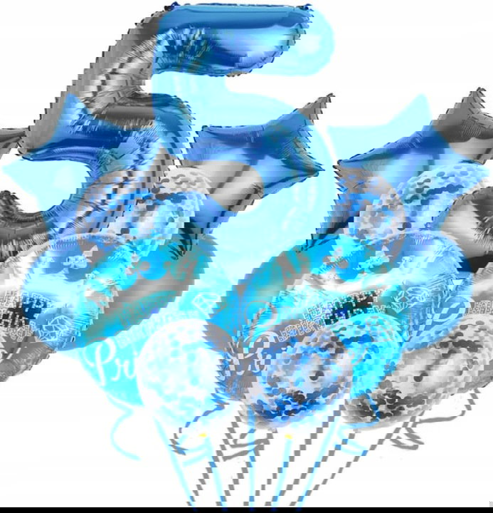 Zawartość: Niebieski XXL 1 balon foliowy 81 cm, 6 x lateksowe balony 30 cm (2 x niebieski, 4 x konfetti), 2 x balony foliowe w gwiazdkach 45 cm, 5 x 45 cm niebieska szczęśliwa kulka urodzinowa, 1 x wstążka balonowa.