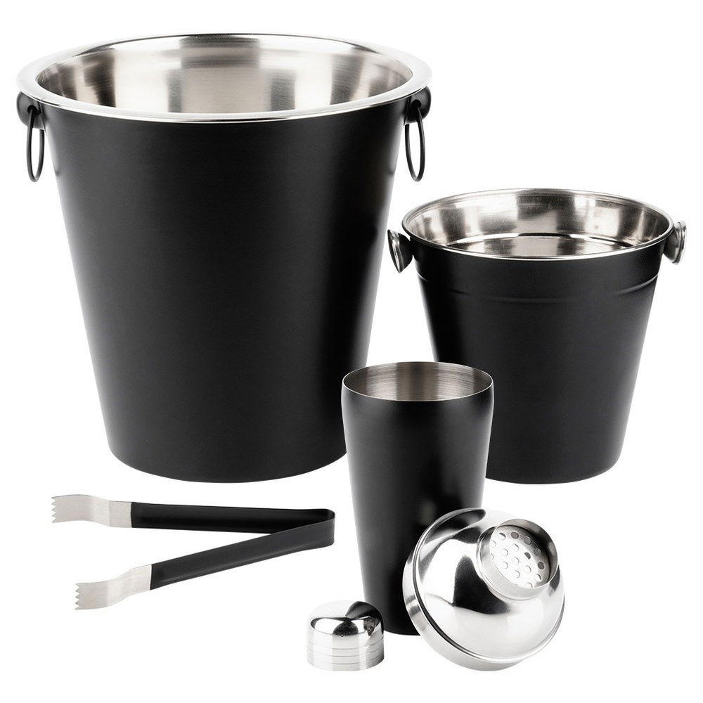 Zestaw barmański zawierający wszystkie potrzebne akcesoria do przygotowania odpowiednich koktajli i drinków. W zestawie: 1x wiaderko małe (średnica 14 cm, wysokość 13 cm), 1x wiaderko duże (średnica 21,5 cm, wysokość 21 cm), 1x shaker (wysokość 21 cm, średnica 8 cm), 1x szczypce (długość 14 cm). Zestaw jest odpowiedni zarówno do użytku domowego jak i profesjonalnym barze. Zestaw ten pozwoli zaskoczyć gości wyjątkowymi koktajlami i drinkami.