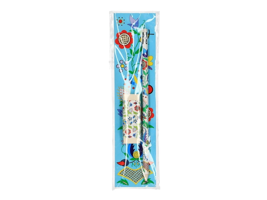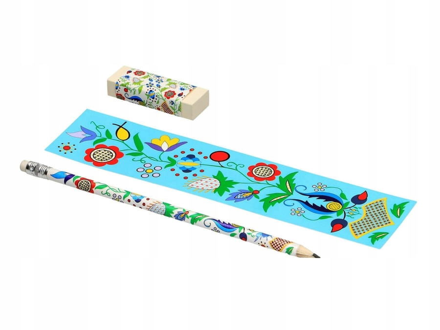 Zestaw folkowy składa się z zakładki, gumki i ołówka.