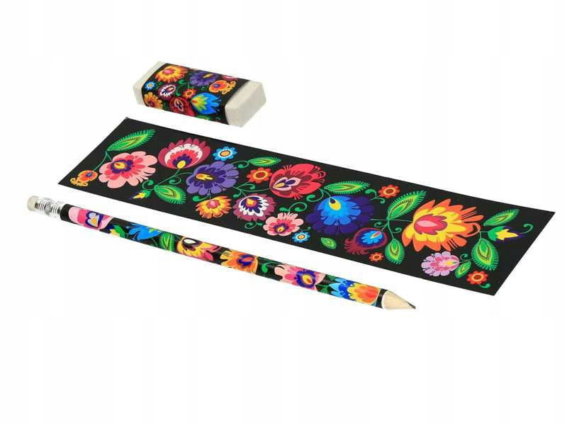 Dzięki kompaktowym wymiarom 5,5 x 21,5 x 1 cm, zestaw jest poręczny i wygodny do noszenia w torebce, plecaku lub piórniku. Zestaw jest zafoliowany, co czyni go gotowym do wręczenia jako prezent — świetny pomysł na upominek dla miłośników polskiej sztuki ludowej i tradycyjnych wzorów.