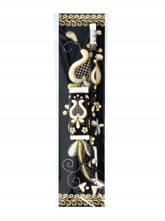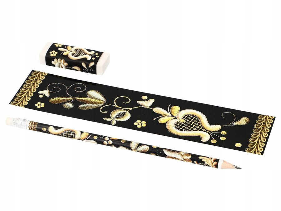 Zestaw mały folk złotnica kaszubska, składa się z zakładki, gumki i ołówka. Całość we wzornictwie haftu czepcowego.