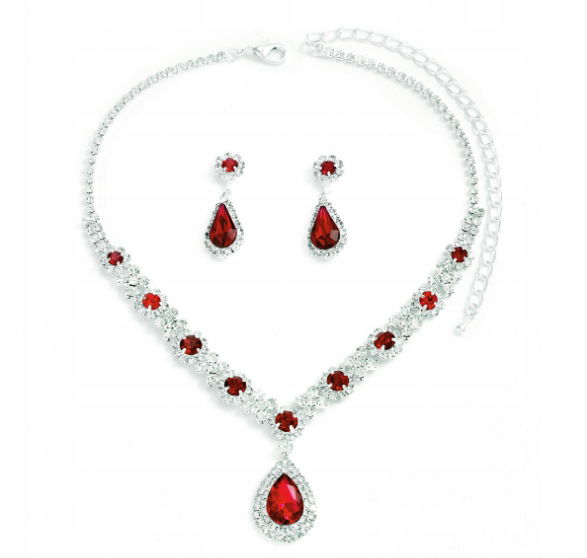 Zestaw Biżuterii Kolczyki Naszyjnik Ślub Srebrny Rubinowy Cyrkonie B25