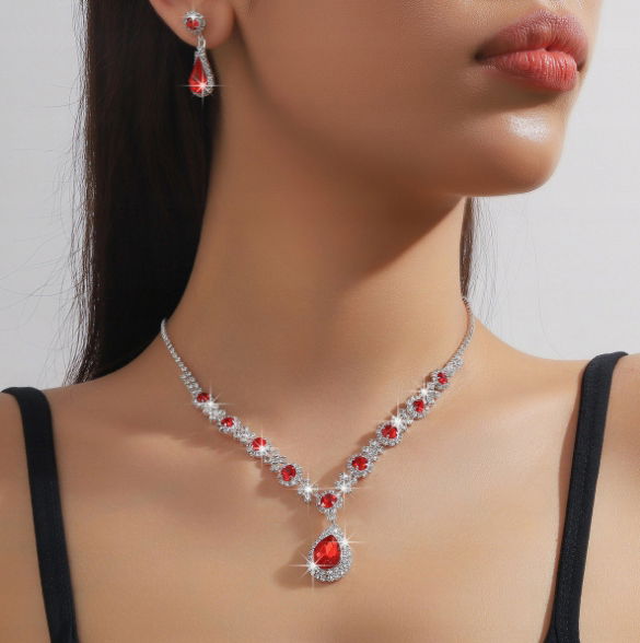 Komplet bizuterii z rubinem Kolczyki Naszyjnik Ślubny Srebrny Cyrkonie
