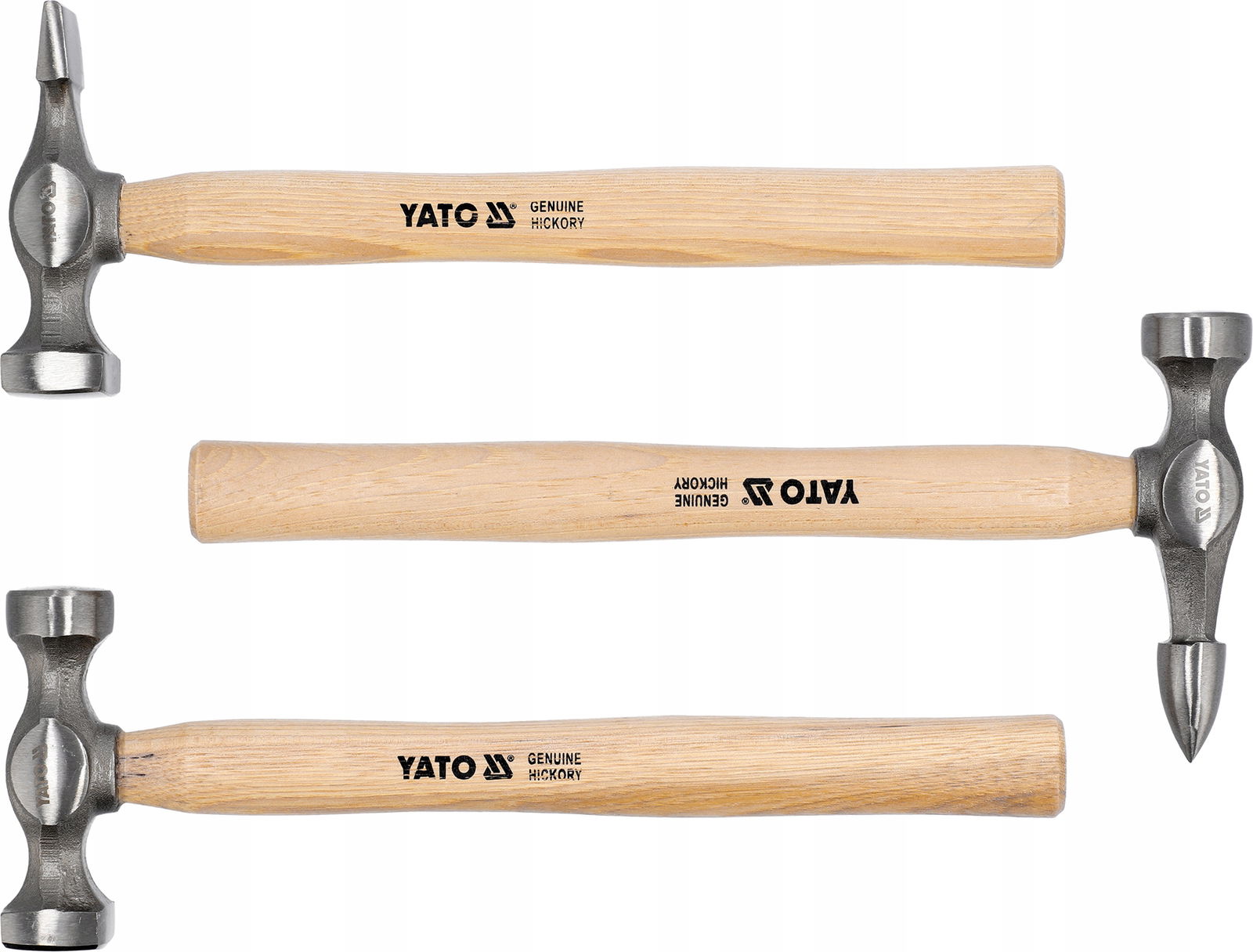 trzy młotki o różnych profilach obuchów, osadzone na trzonkach z drewna hikorowego