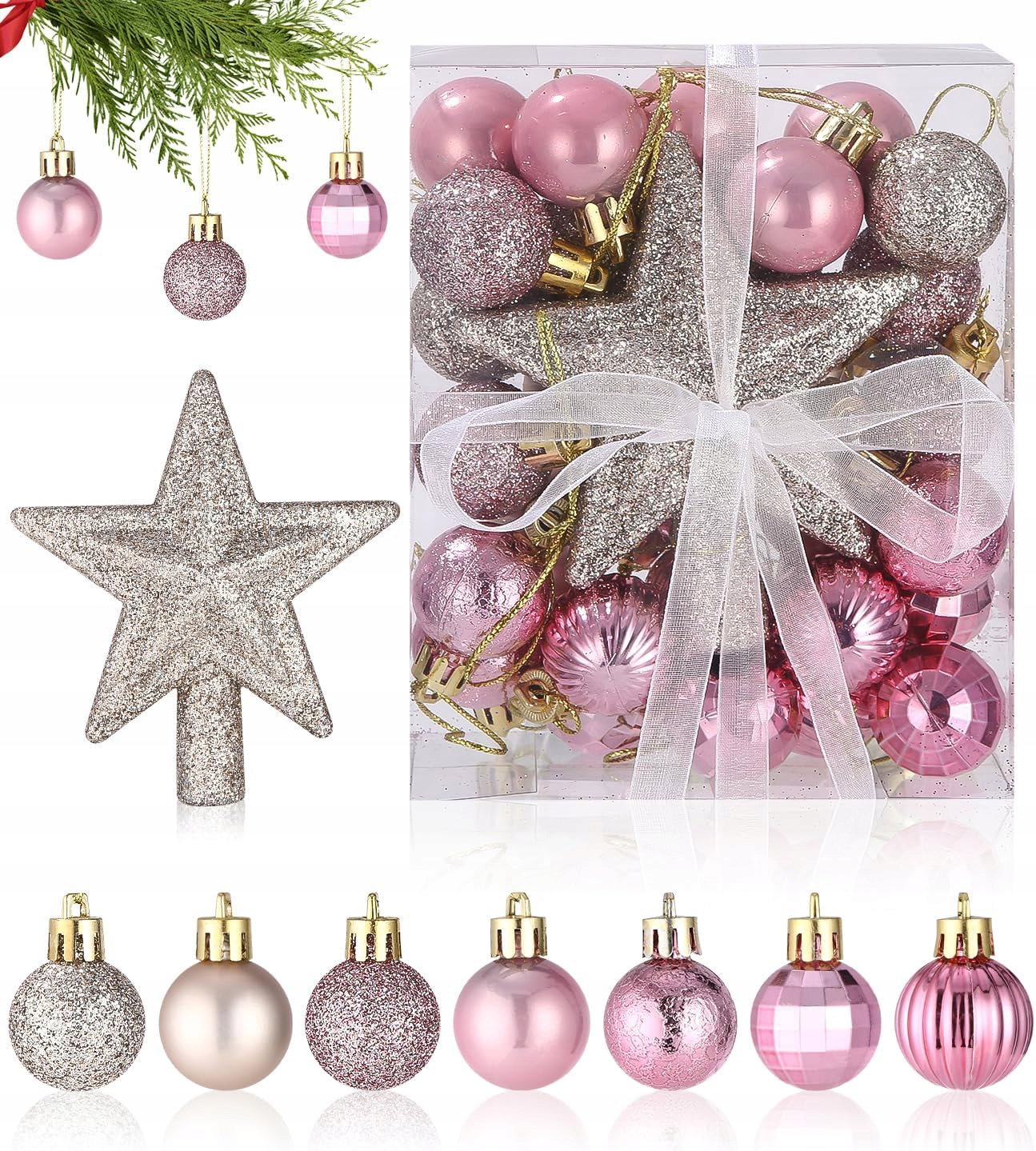 Zestaw bombek na choinkę + gwiazda, 30 szt., odcienie różu, brokat