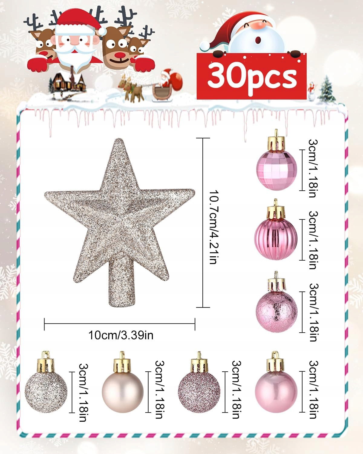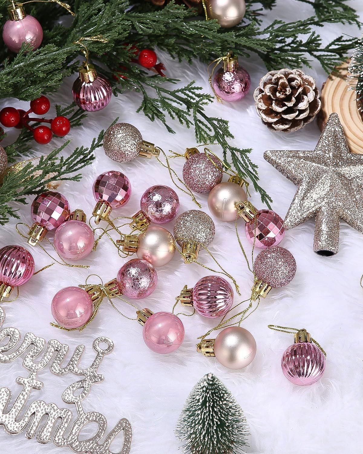 Zestaw miniaturowych bombek choinkowych: Opakowanie zawiera 29 bombek i 1 złotą gwiazdę na czubek choinki. Bombki mają średnicę ok. 3 cm i są dostępne w 7 wzorach: spirala w kolorze różowego złota, lustrzane różowe złoto, gładkie różowe złoto, matowe różowe złoto, brokat w kolorze różowego złota, matowe złoto, brokat w kolorze złotego złota.