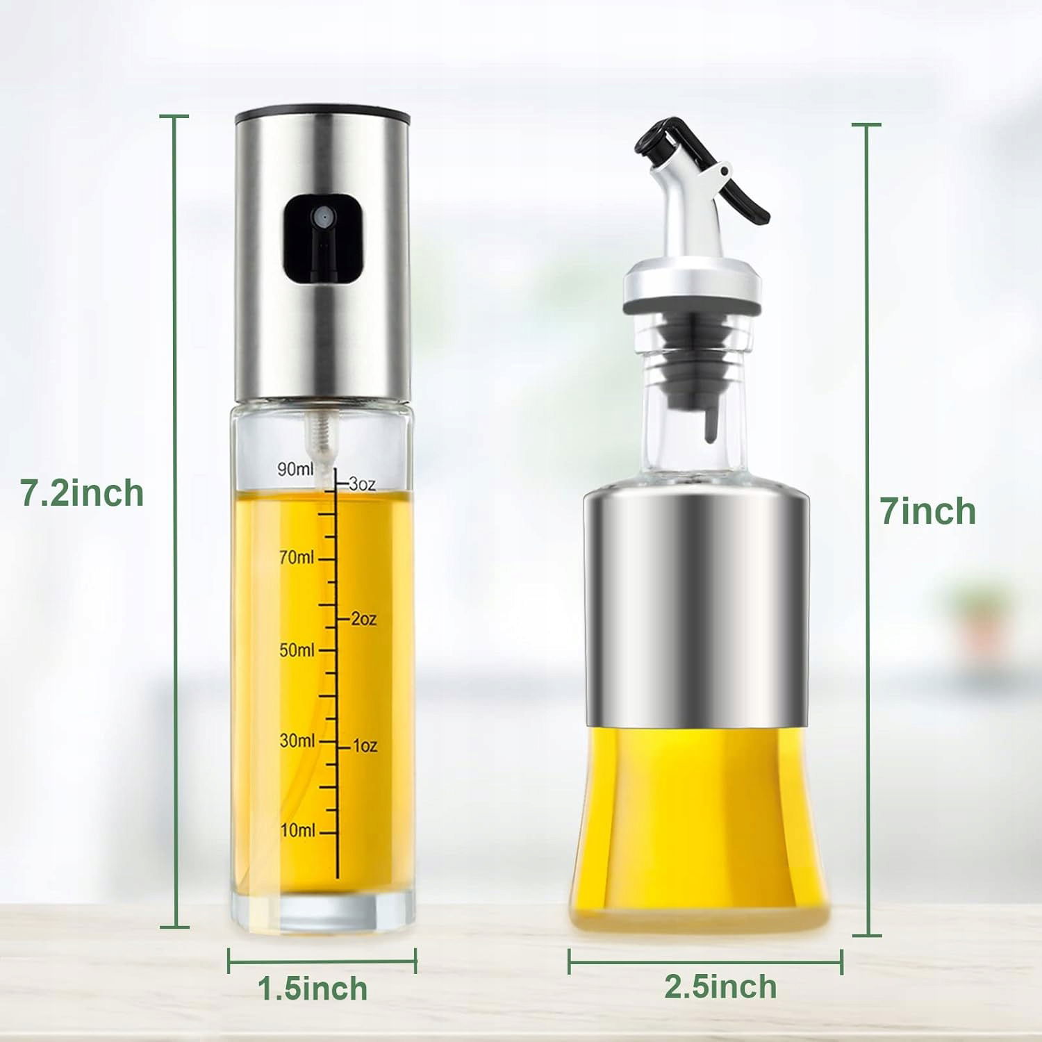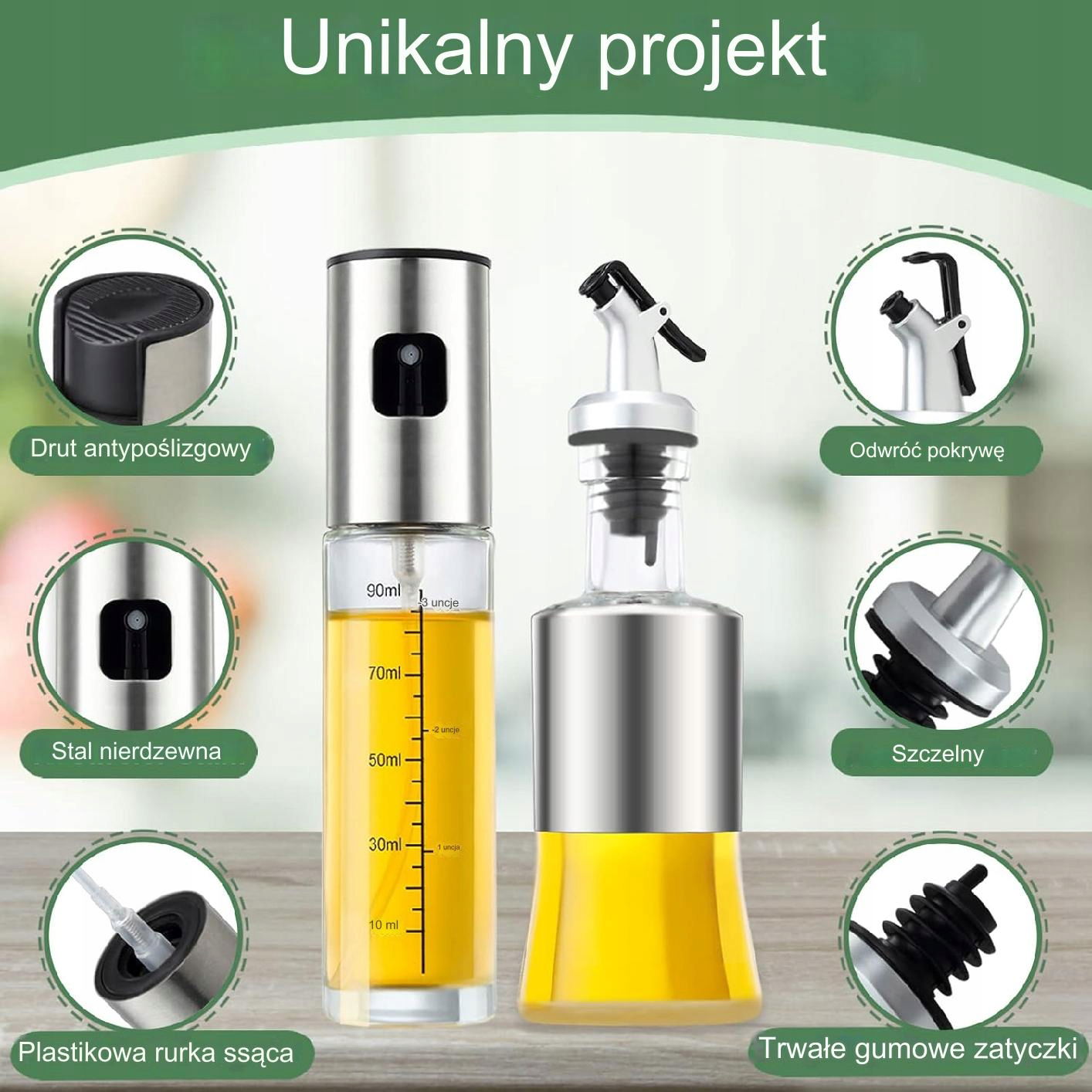 Butelkę i rozpylacz można używać zgodnie z potrzebami, aby precyzyjnie dozować olej, ocet, sok z cytryny i inne płyny, umożliwiając zdrowsze odżywianie. Idealny zestaw do frytkownic, sałatek, grillowania, gotowania i wielu innych zastosowań kulinarnych.
