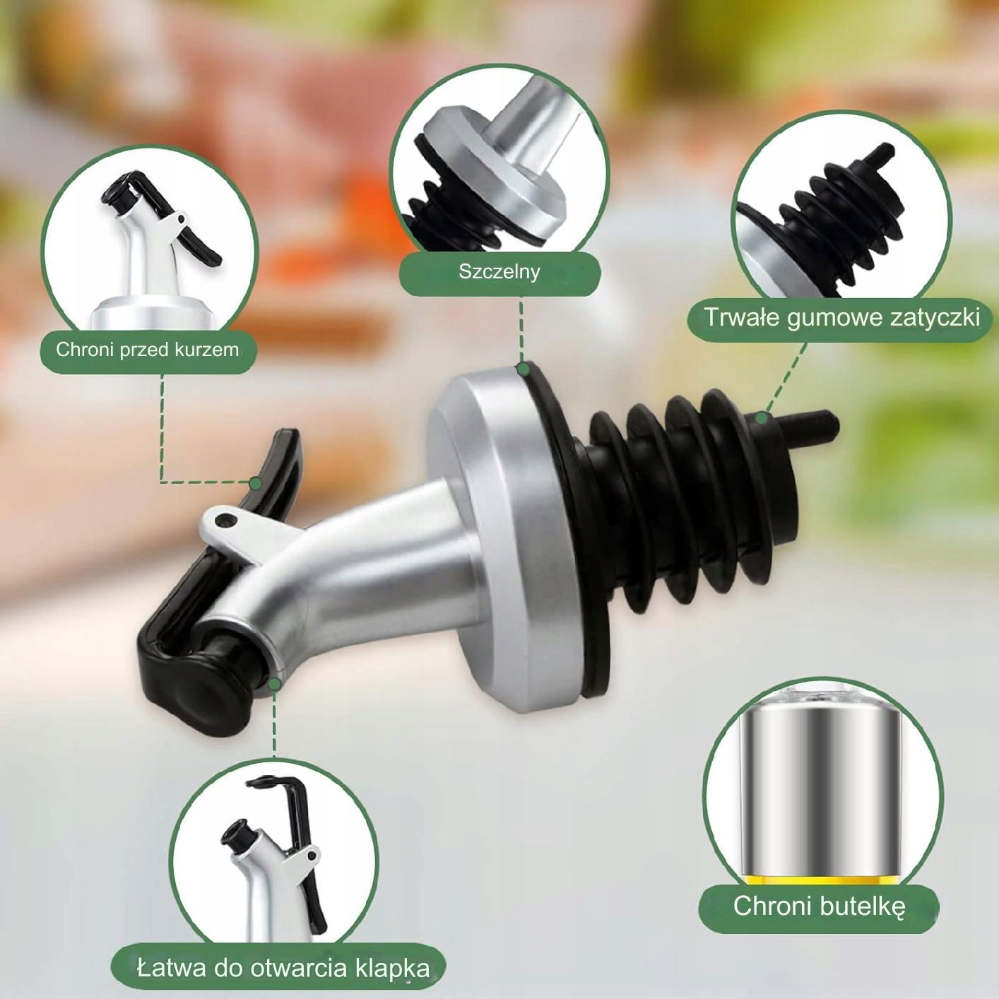 Butelka posiada pierścień ze stali nierdzewnej, który chroni krawędzie, zwiększając odporność na uszkodzenia. Delikatne naciśnięcie dyszy rozpylacza tworzy równomierną mgiełkę, idealną do precyzyjnego dozowania oleju lub innych płynów.