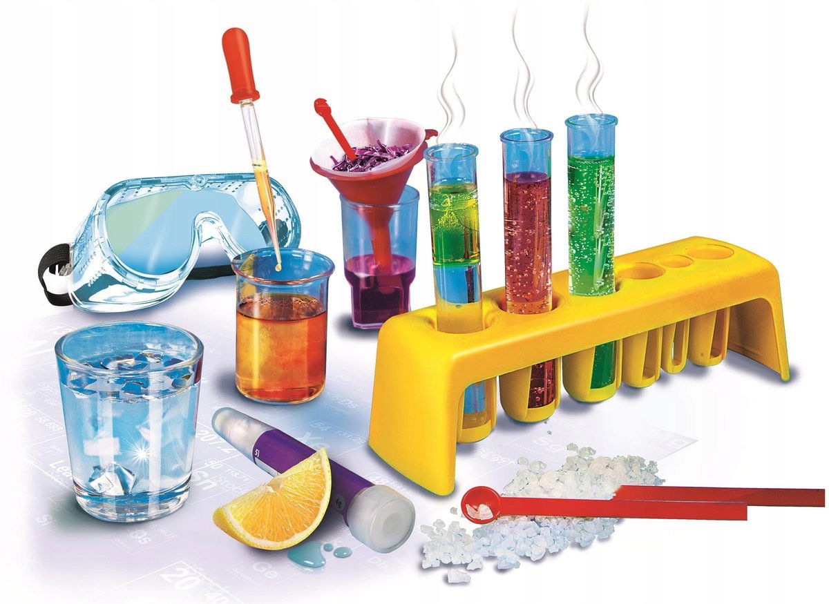 - Zawartość zestawu: okulary ochronne, probówki z korkami, pipety, lejki, miarki, szczoteczka, pinceta, mieszadełko, bezpieczne substancje chemiczne, ilustrowana instrukcja