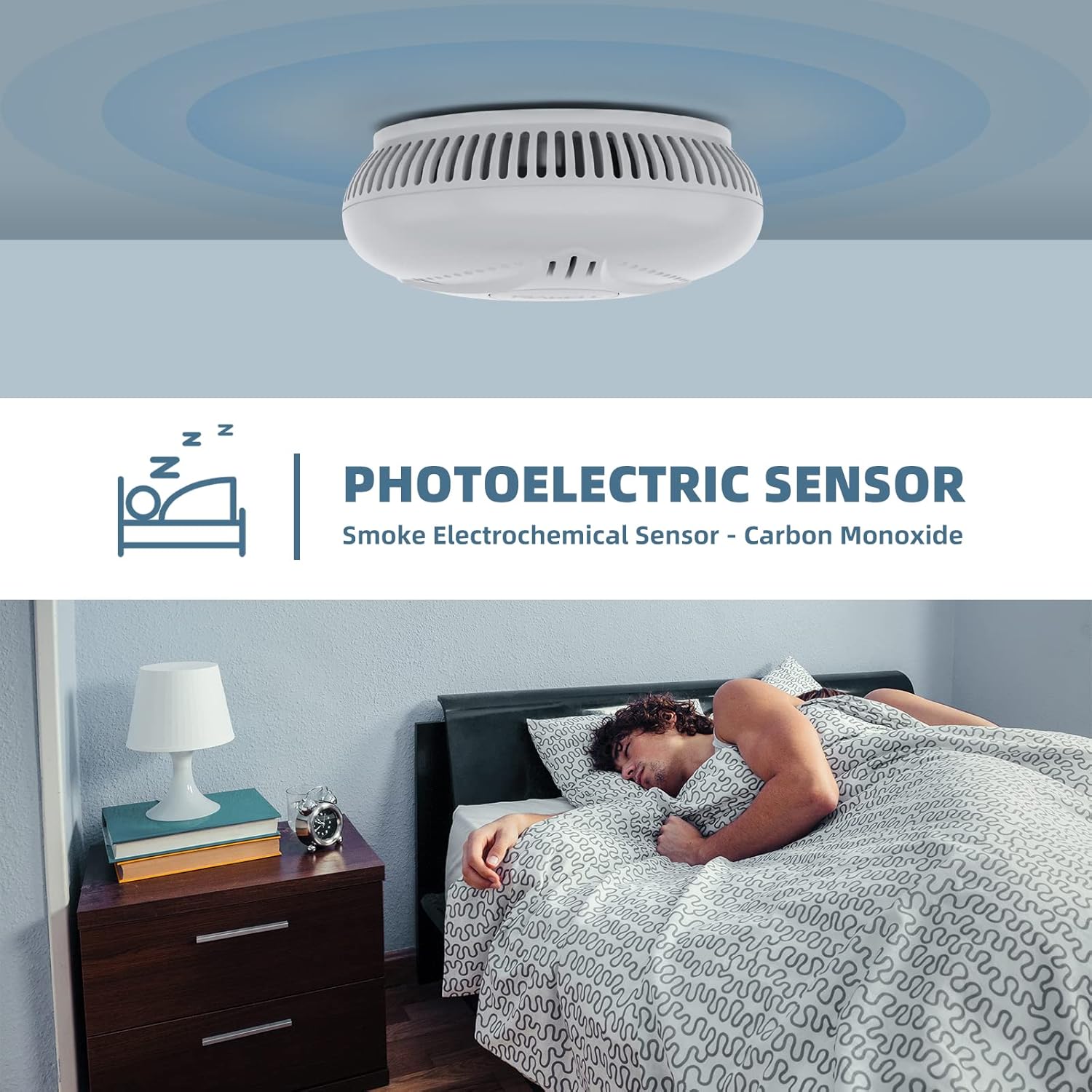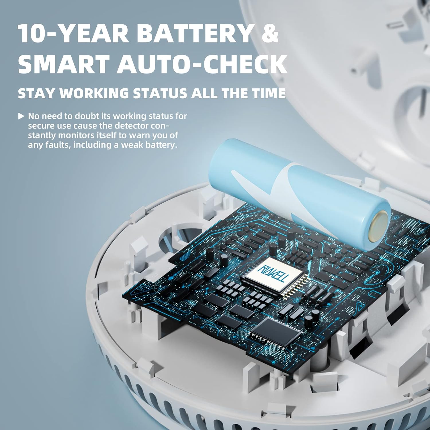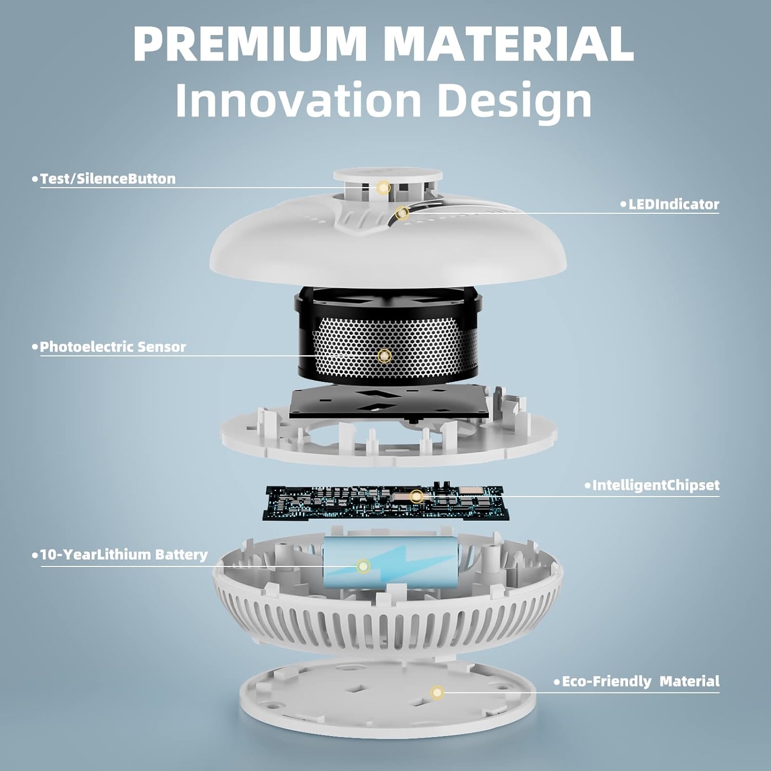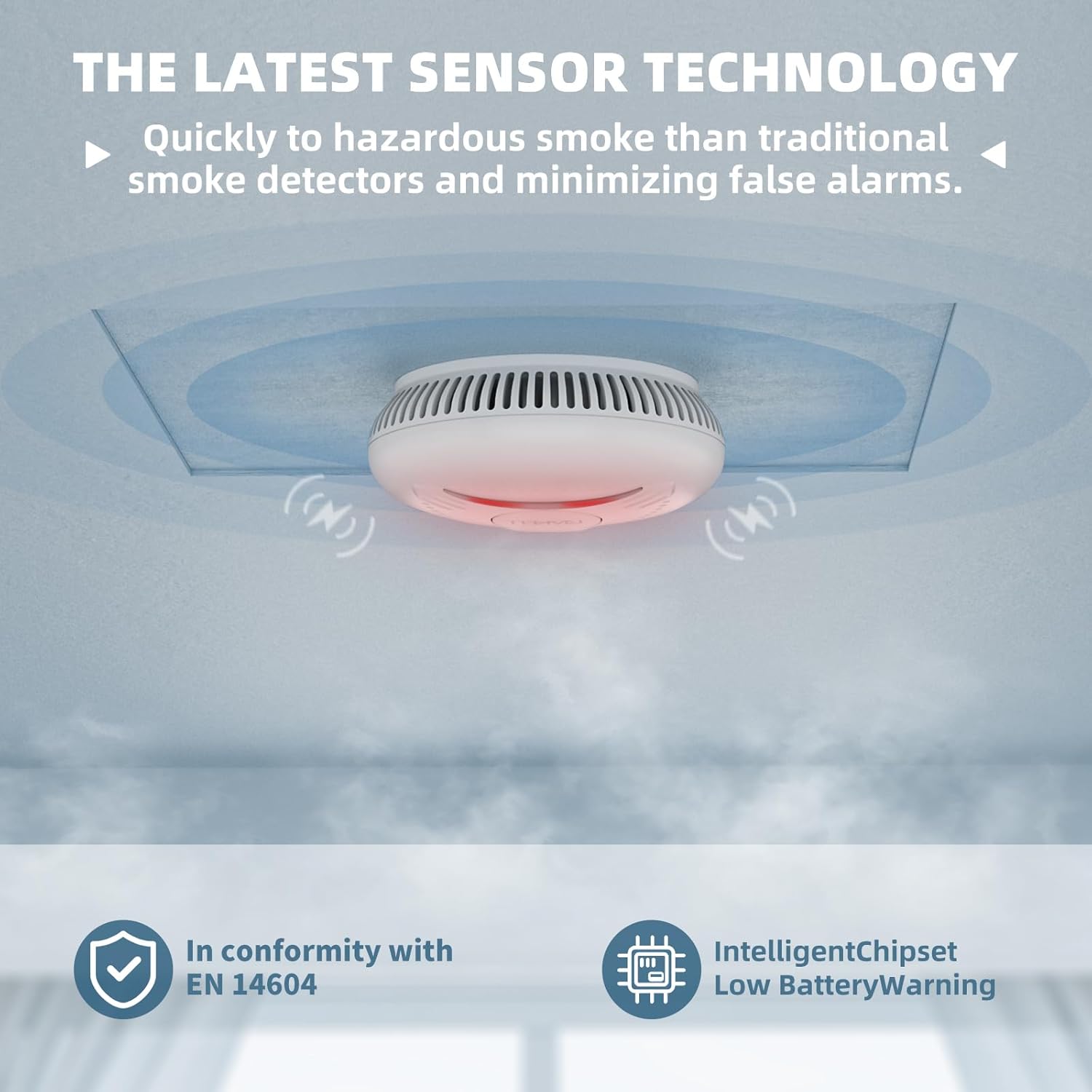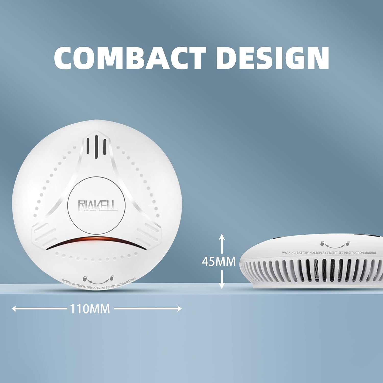 Typ czujnika: czujnik fotoelektryczny. Przenikający sygnał alarmowy: Zasilanie 85 dB: DC3 V bateria litowa. Żywotność produktu: 10 lat Waga: 140 g. Wymiary: Ø 110 mm x wys. 42 mm Mocowanie: Płyta montażowa z kołkami i śrubami.