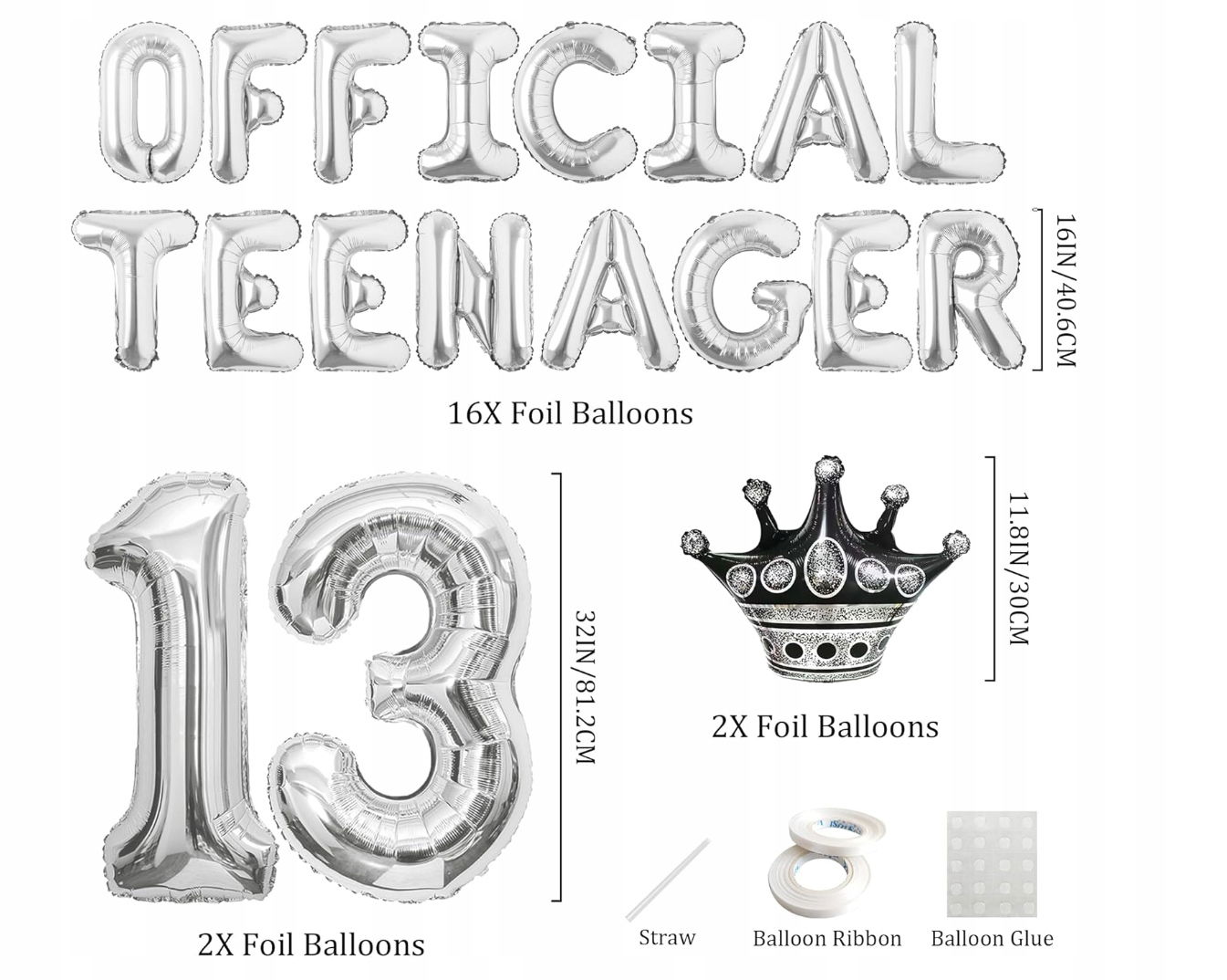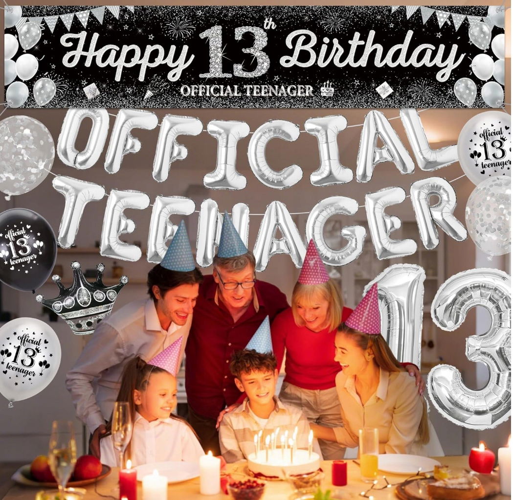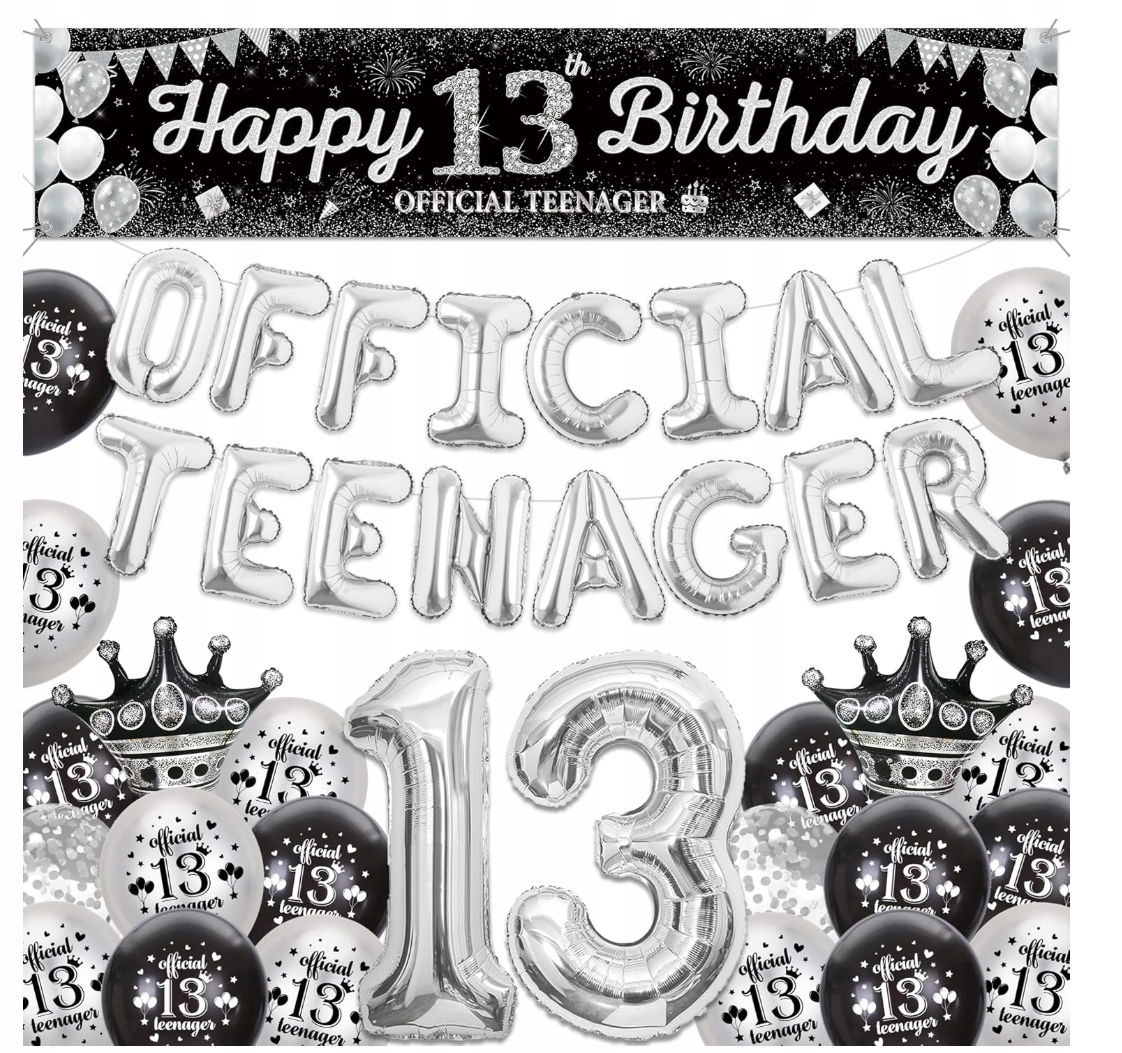 - ✴️ Kompletny zestaw dekoracji na 13 urodziny –W zestawie znajdziesz wszystko, czego potrzebujesz: baner „Happy Birthday”, 2 duże balony foliowe z cyfrą 13 (32”), 16 balonów foliowych srebrnych, 2 balony w kształcie korony, 20 balonów z nadrukiem oraz 2 balony konfetti.