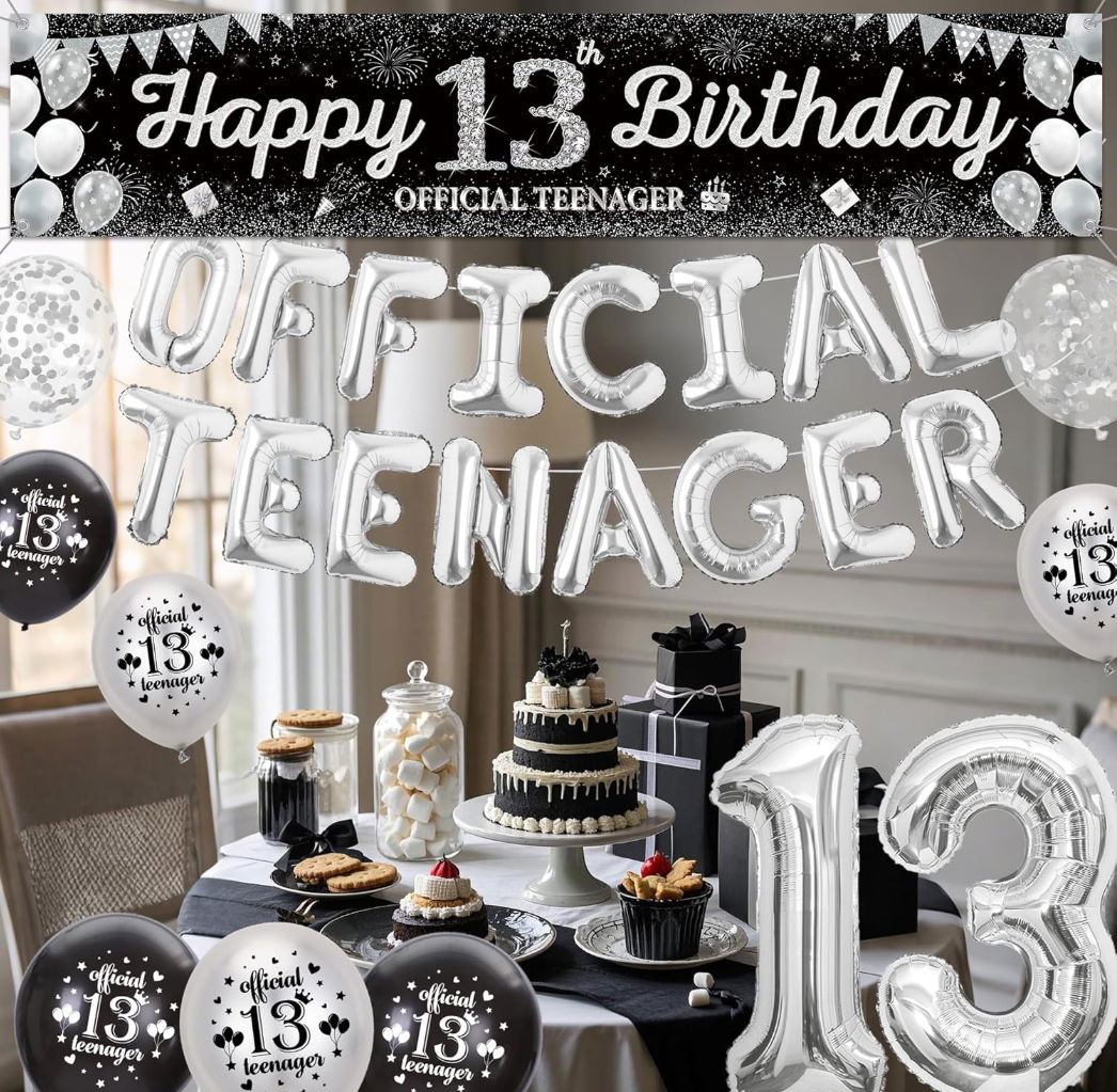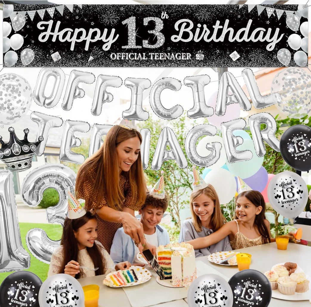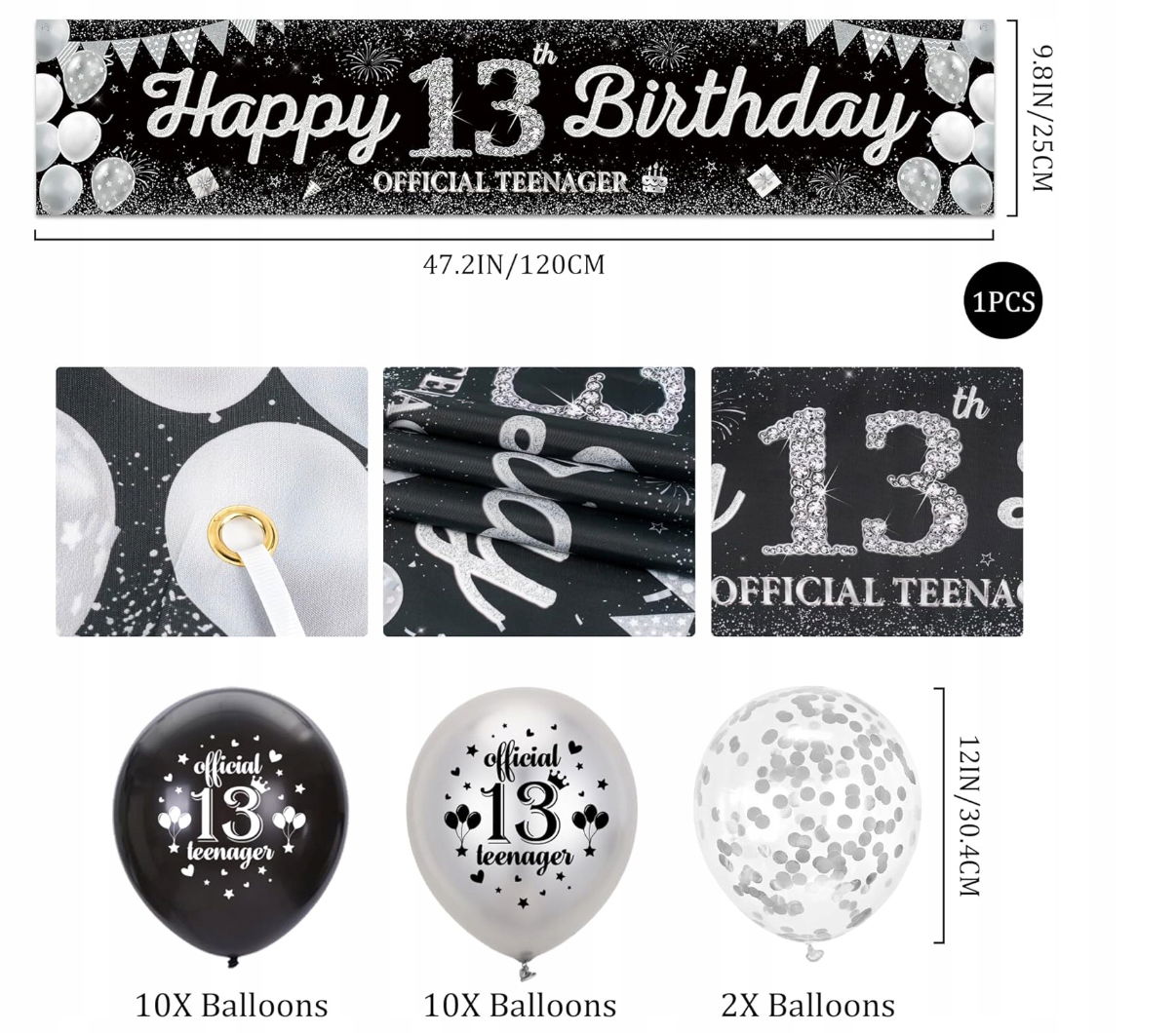 - ✴️ Kompletny zestaw dekoracji na 13 urodziny –W zestawie znajdziesz wszystko, czego potrzebujesz: baner „Happy Birthday”, 2 duże balony foliowe z cyfrą 13 (32”), 16 balonów foliowych srebrnych, 2 balony w kształcie korony, 20 balonów z nadrukiem oraz 2 balony konfetti.