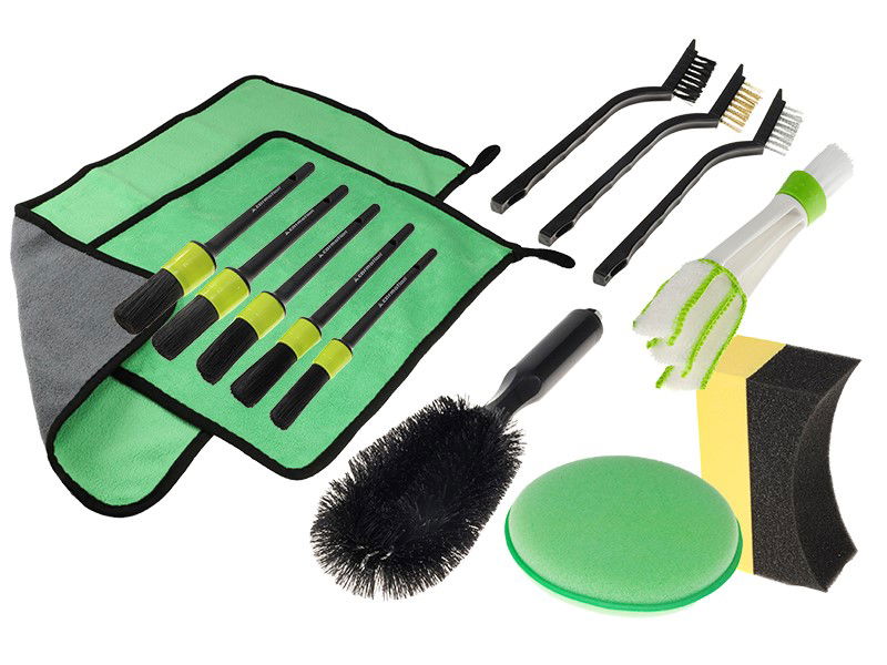 Zestaw detailingowy, 14 elementów, to kompleksowy zestaw dedykowany entuzjastom detalingu pojazdów. W skład zestawu wchodzą wysokiej jakości narzędzia umożliwiające precyzyjną pracę nad pojazdemW skład zestawu wchodzą:- Ścierka z mikrofibry (2 sztuki)- Pędzle detailingowe 10", 12", 14", 16", 18"- Szczotka nylonowa z uchwytem - Czyścik do nawiewów i szczelin- Szczotka druciana x1, szczotka mosiężna x1, szczotka nylonowa x1- Gąbka piankowa aplikator do wosku (1 sztuka)- Wielofunkcyjna gąbka 2 w 1 w kształcie półksiężyca o 2 stopniach gęstości