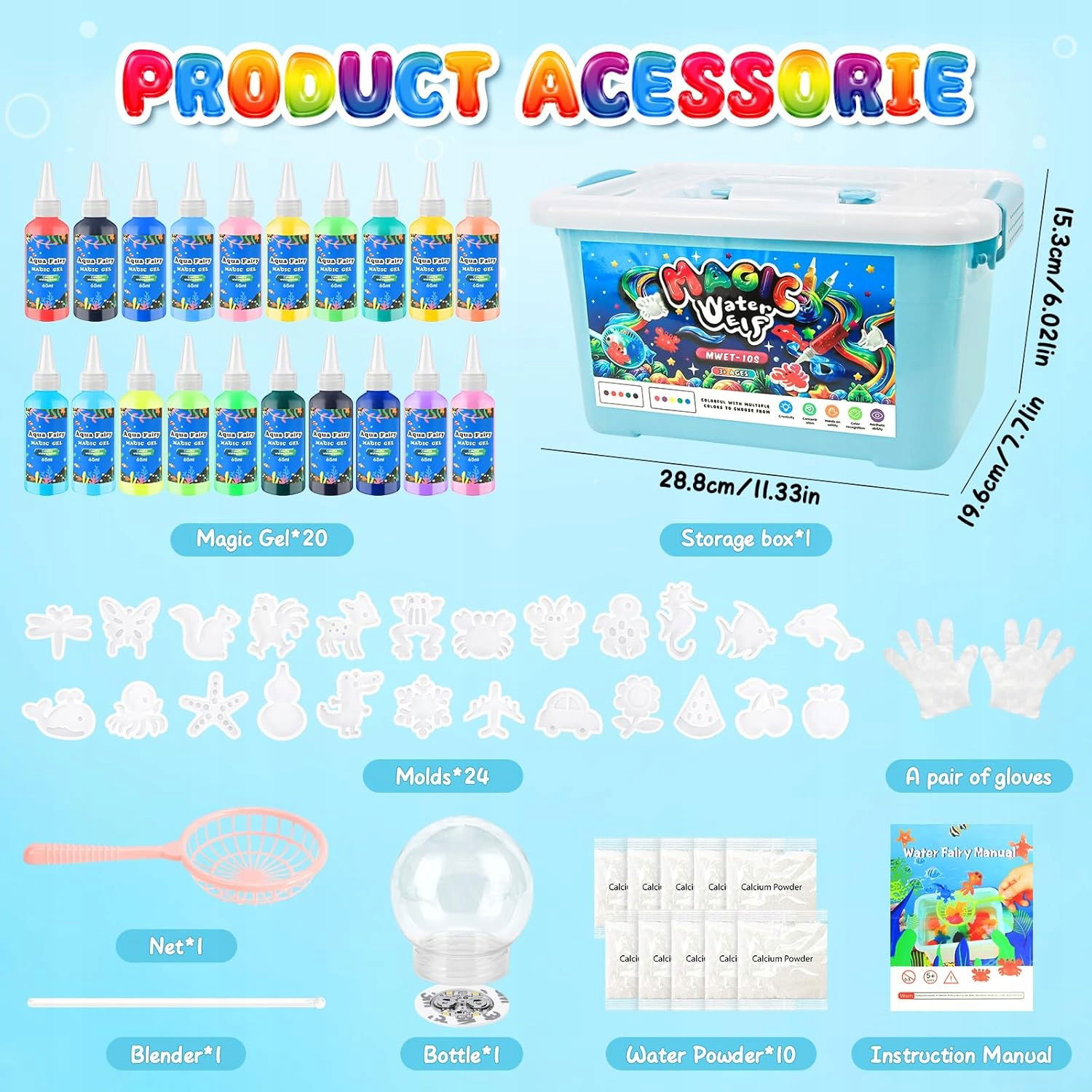 5️⃣ Water Elf Powder – 10 torebek proszku wapniowego do przygotowania roztworu, w którym żel zamienia się w figurkę.