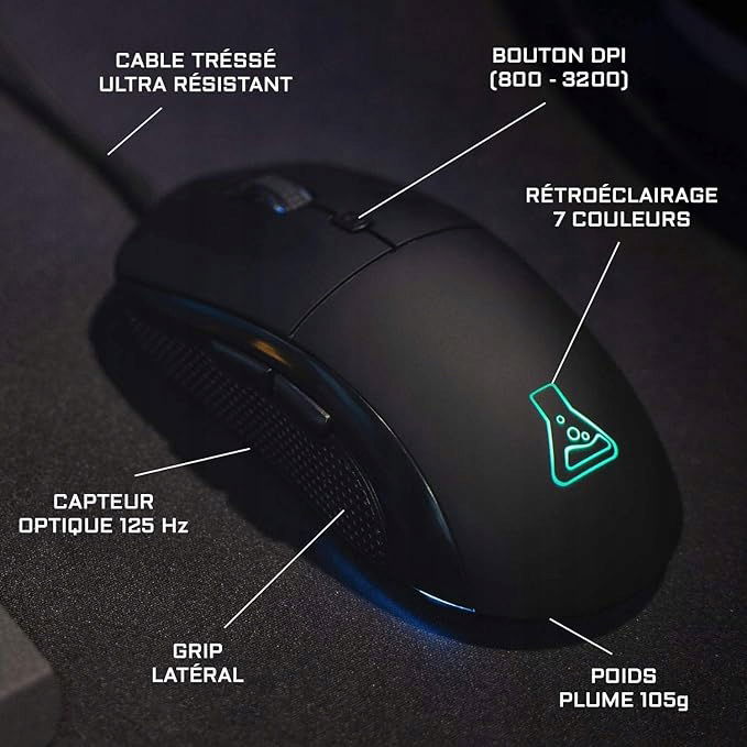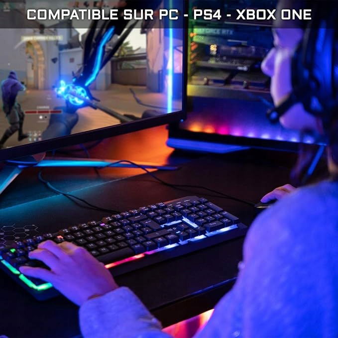 WYDAJNA KLAWIATKA + WSPANIAŁa. Klawiatura dla graczy 105 klawiszy z 19 przyciskami antyghostingowymi, aby uniknąć niepożądanych konfliktów i działań. Bardzo dobra jakość pisania: responsywne, precyzyjne i szybkie. Wielokolorowe stałe podświetlenie z możliwością zmiany jasności. Ultra wytrzymały kabel pleciony, gumowe podkładki, francuski układ AZERTY. 12 klawiszy skrótów multimedialnych i możliwość blokowania klawisza Windows w grze, aby uniknąć przypadkowych zwrotów na pulpicie.