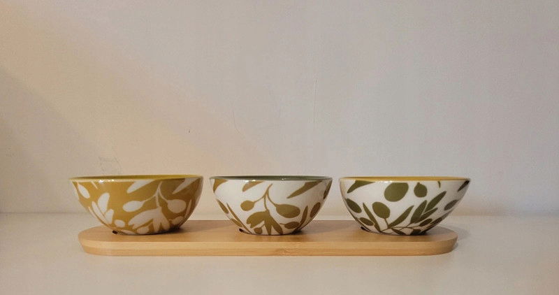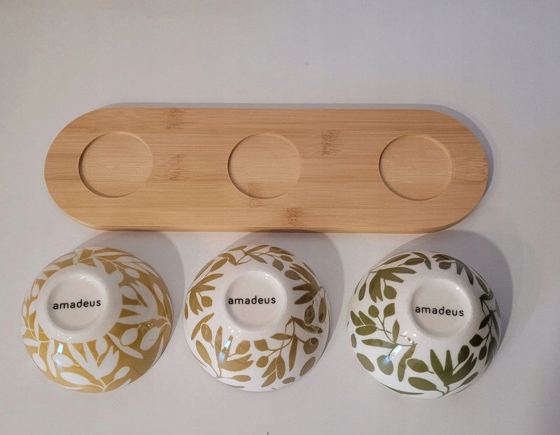 Zestaw do aperitifu Olivia składa się z trzech porcelanowych miseczek i drewnianej tacy.