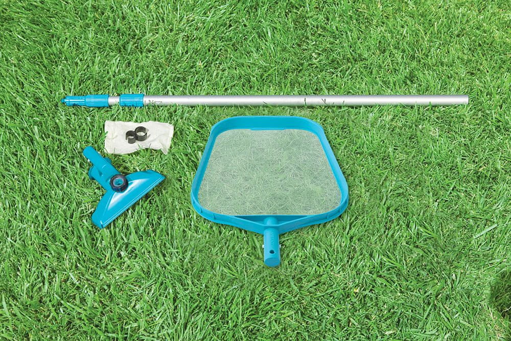 Komfortowe używanie do maksymalnej średnicy 488. Wyposażenie zawiera także końcówkę odkurzającą (działa po podłączeniu węża ogrodowego wypłukując brudy pod ciśnieniem wody) oraz siatkę.
