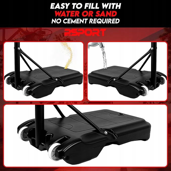Kosz do koszykówki dla dzieci ProSport jest wyposażony w wytrzymałą 32-litrową podstawę, którą można łatwo napełnić piaskiem lub wodą, aby umożliwić możliwie stabilną grę. Stojak do koszykówki posiada również kółka, dzięki czemu jest łatwy do przenoszenia i przenoszenia, aby przykryć zimą.