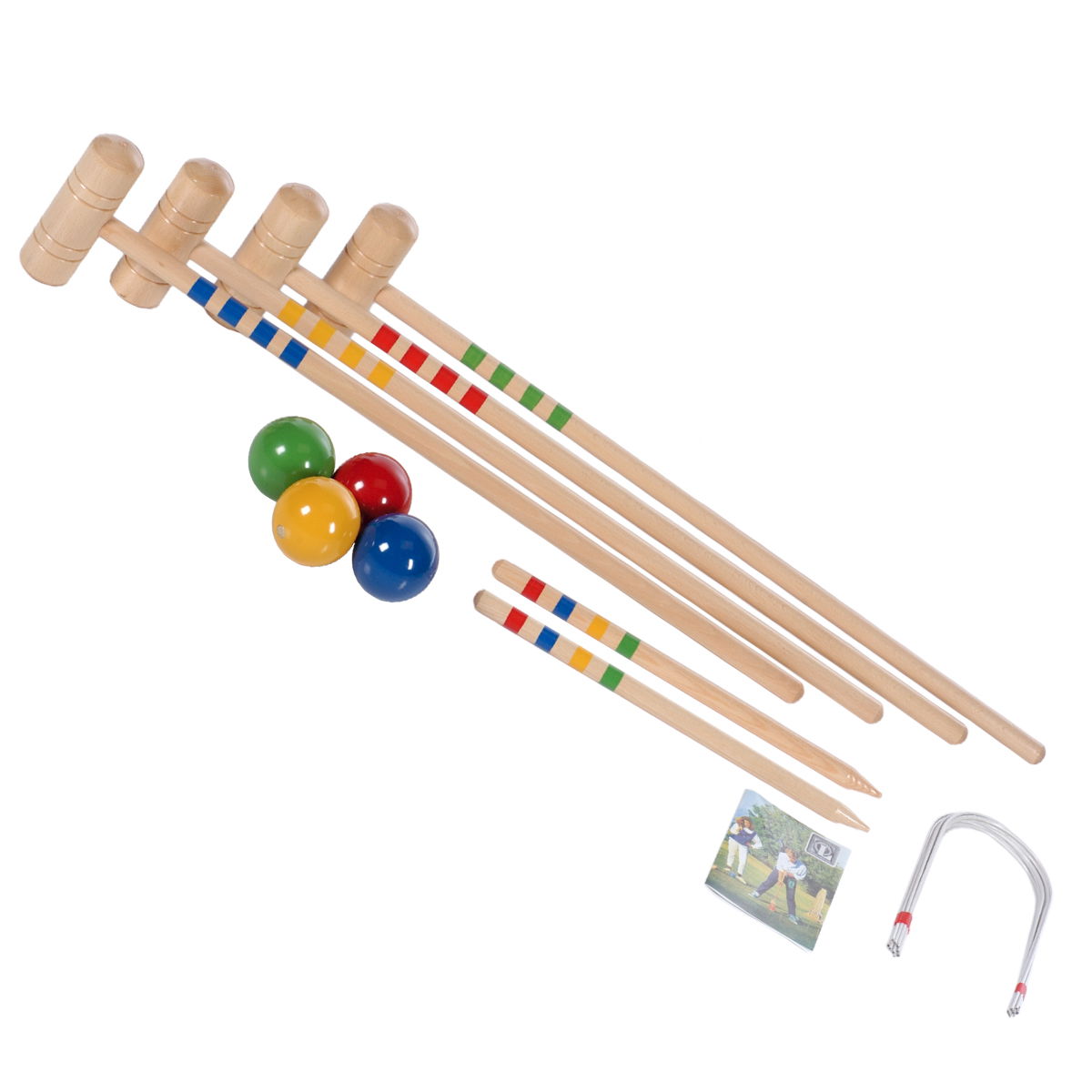 4 wytrzymałe kije do krokieta (80 cm) 4 precyzyjnie wykonane kule (70 mm) 10 solidnych bramek 2 praktyczne szpilki