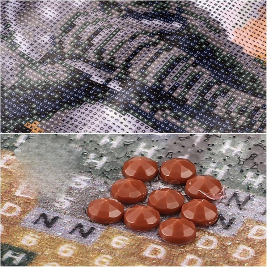 - Łatwe w użyciu: koraliki są dopasowane kolorystycznie do oznaczeń znajdujących się na schemacie umieszczonym z boku obrazu. Diamenty jednego koloru należy wsypać do miseczki, następnie dotknąć narzędziem kleju, by nabrać jego niewielką ilość na aplikator. Kolejnym krokiem jest podniesienie diamentu i umieszczenie go na odpowiednim numerze na podkładzie.
