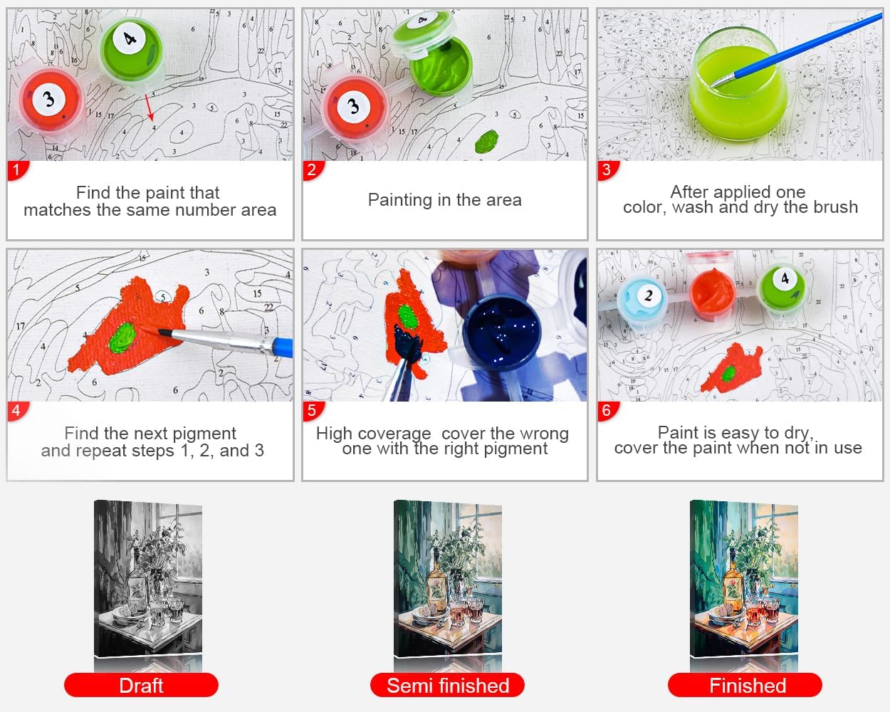 Otrzymasz wysokiej jakości płótno oraz nietoksyczne farby akrylowe o intensywnych kolorach, dzięki którym obraz ożyje. Farby zapewniają doskonałe pokrycie, umożliwiają poprawki i są wodoodporne po wyschnięciu.