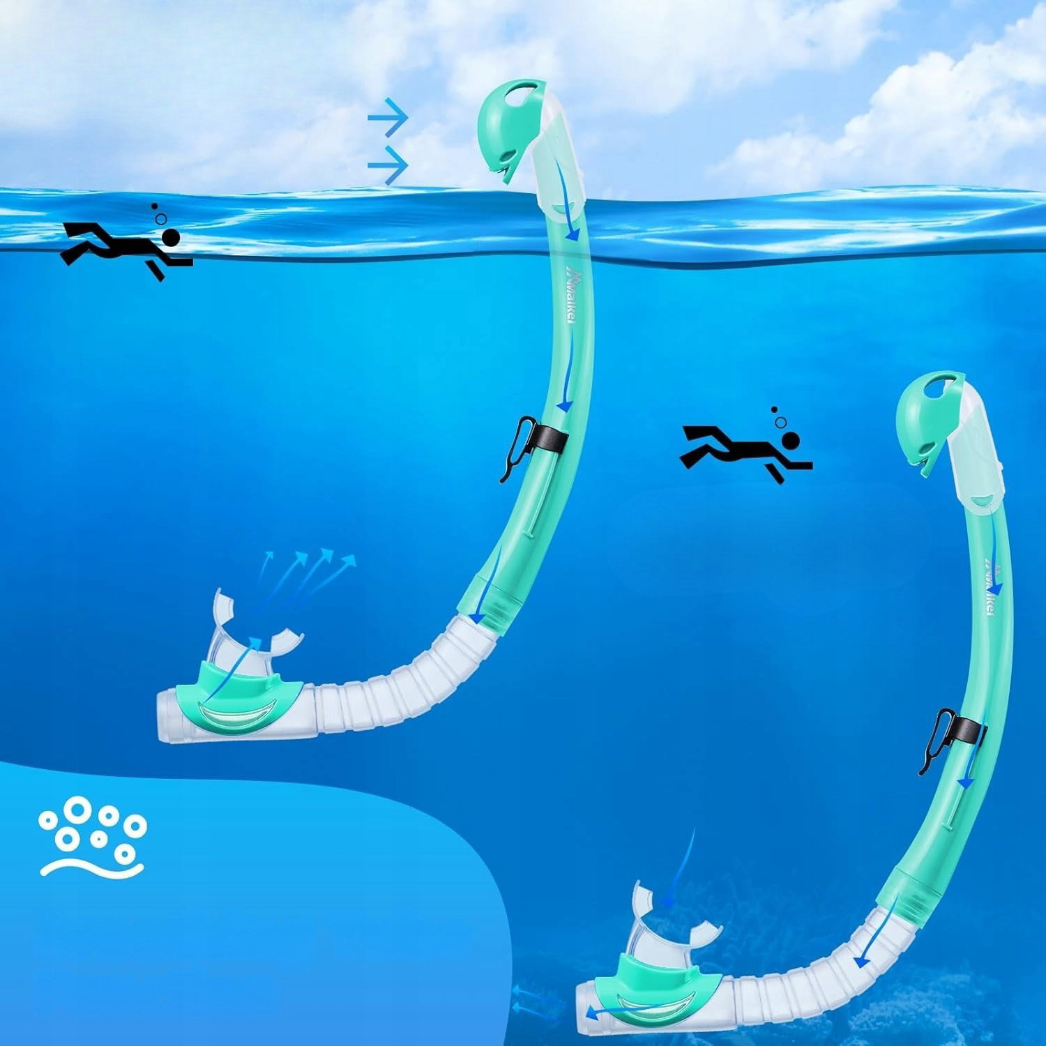 - Rurka Dry Top – ochrona przed wodą: fajka wyposażona w system dry top automatycznie zamyka dopływ wody w momencie zanurzenia. Po wynurzeniu zawór otwiera się, umożliwiając swobodne oddychanie. Mechanizm ten ogranicza ryzyko dostania się wody do rurki i ułatwia naukę snorkelingu.