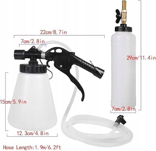 ✅ Łatwa obsługa – Wybierz odpowiedni adapter, podłącz butelkę do głównego cylindra, napełnij ją płynem i otwórz zawór. Następnie podłącz zbiornik próżniowy do sprężarki powietrza (brak w zestawie), podłącz wąż odpowietrzający i otwórz odpowietrznik.