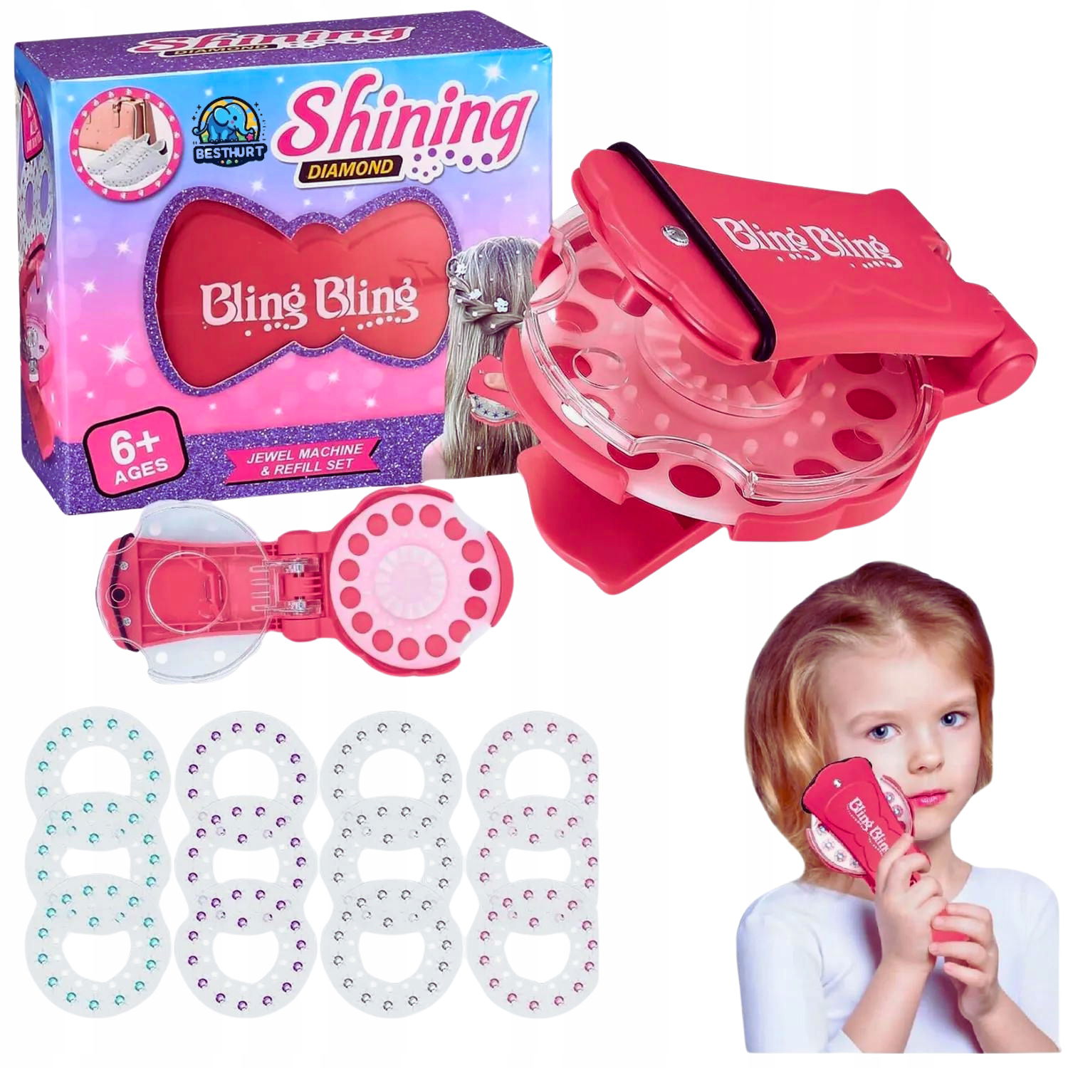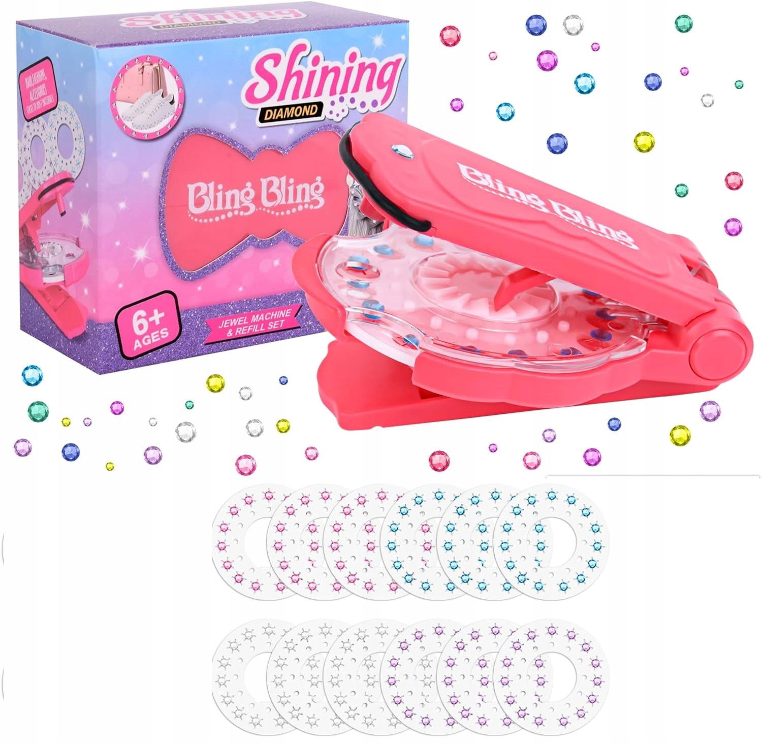 Odkryj kreatywną zabawę z zestawem "Shining Diamond" Bling Bling, który pozwoli Twojemu dziecku stworzyć własną, błyszczącą biżuterię! Idealny dla młodych projektantów, zestaw zawiera maszynę do tworzenia biżuterii i komplet akcesoriów.