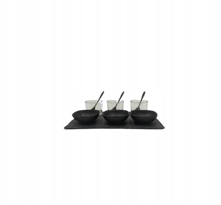 Zestaw umieszczony na tacy z naturalnego łupka w kolorze czarnym.