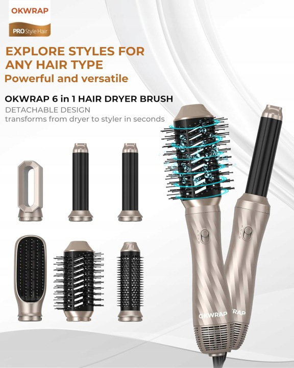 - 6 wymiennych nasadek: Jedno urządzenie zastępuje suszarkę, lokówkę, prostownicę oraz szczotkę termiczną! ⚙️ ?