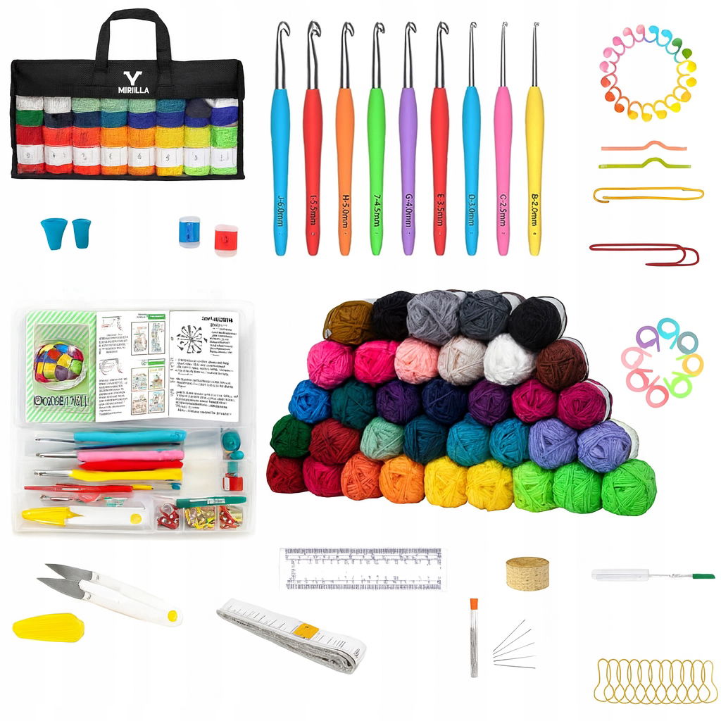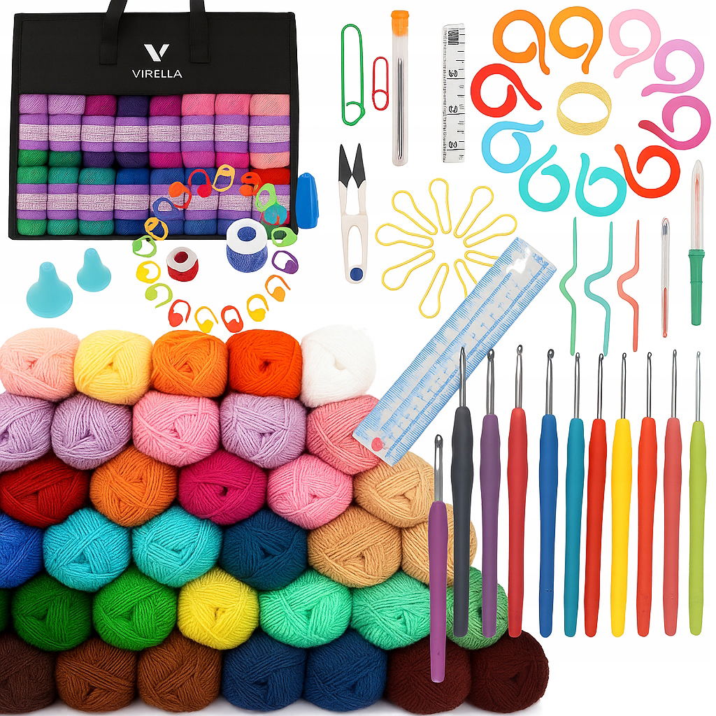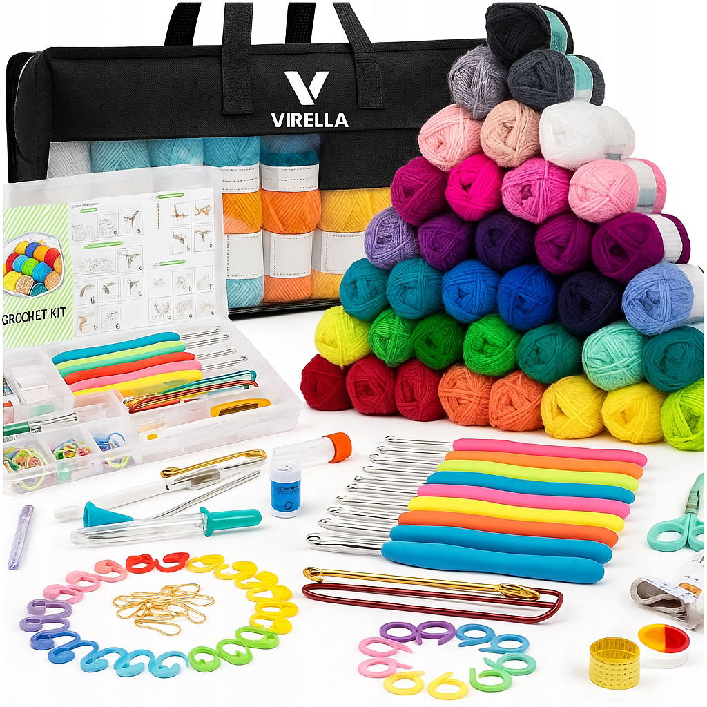 ✅ 40 Motków Włóczki | ✅ 9 Szydełek 2–6 mm (ergonomiczne) | ✅ 40 Znaczników Ściegu | ✅ Liczniki Rzędów x2 | ✅ Nożyczki, Centymetr, Prujka | ✅ Igły Metalowe + Do Przeciągania | ✅ Organizer z Przegródkami | ✅ Torba VIRELLA z Okienkiem | ✅ Lekki, Mobilny Zestaw | ✅ Idealny Na Prezent