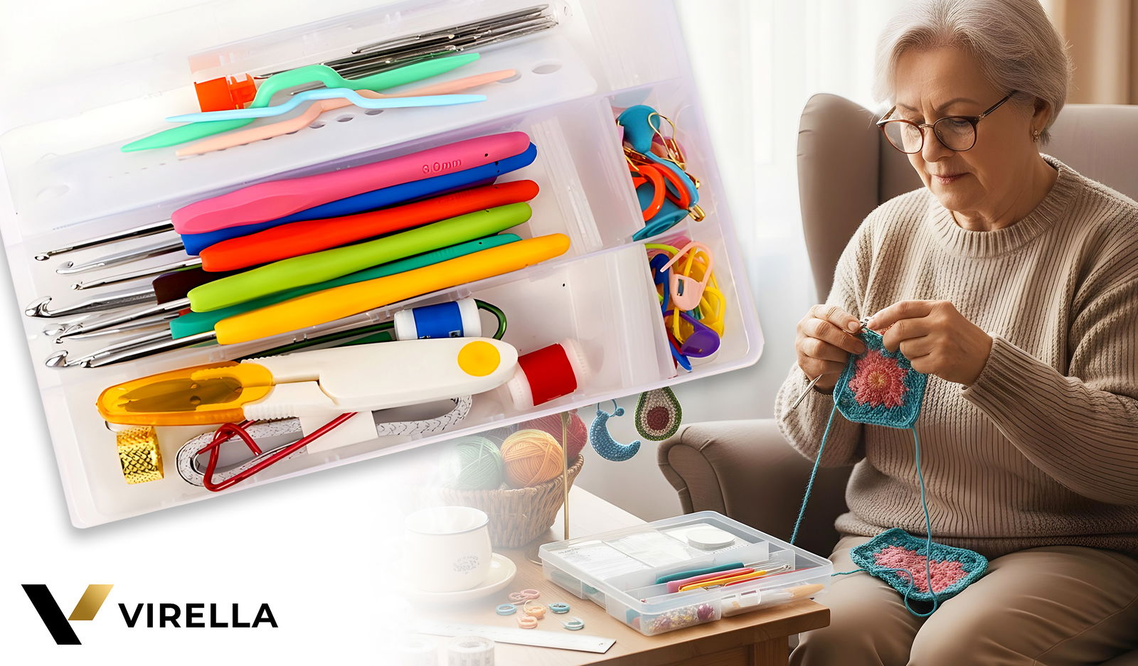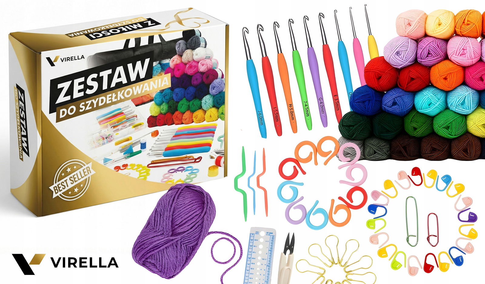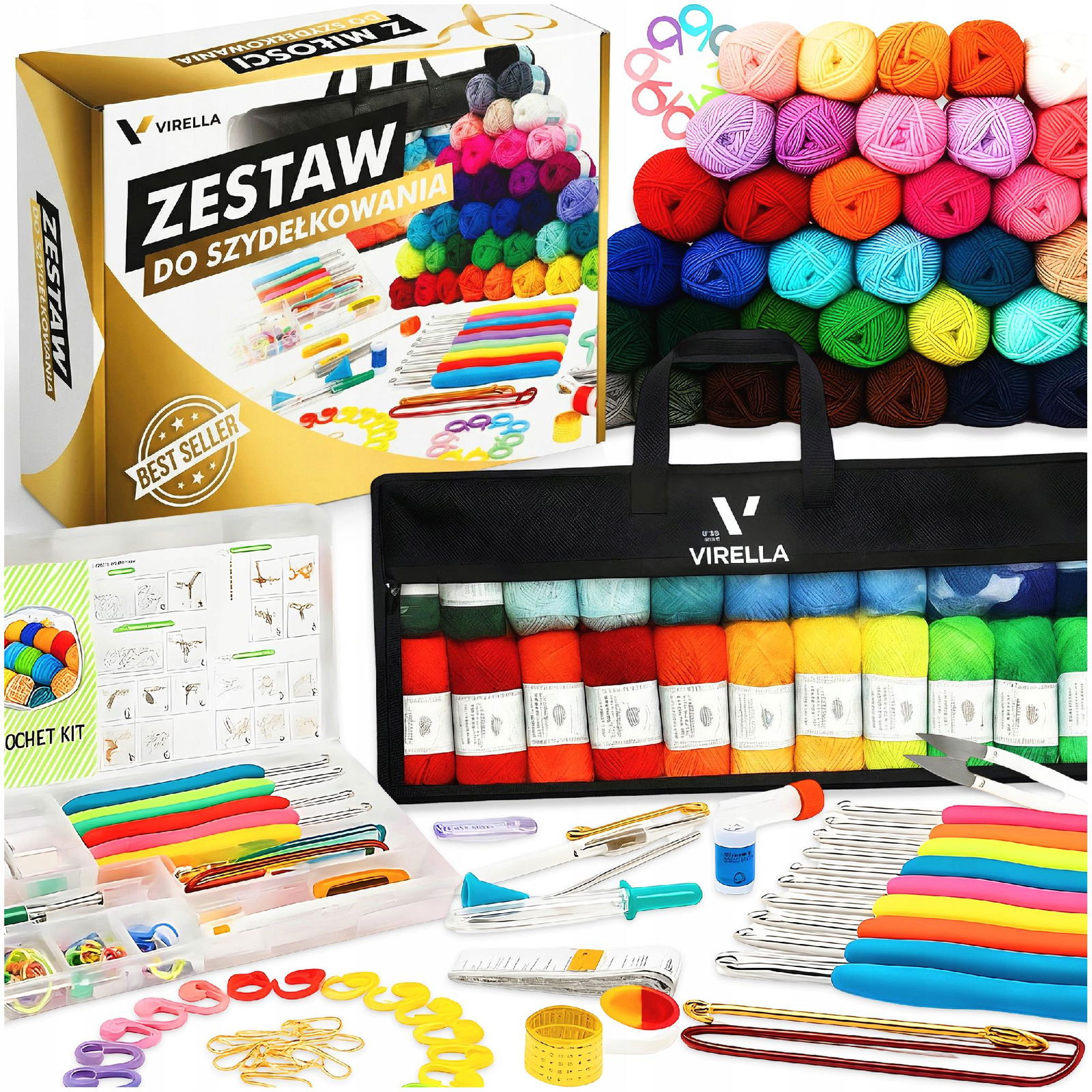✅ 40 Motków Włóczki | ✅ 9 Szydełek 2–6 mm (ergonomiczne) | ✅ 40 Znaczników Ściegu | ✅ Liczniki Rzędów x2 | ✅ Nożyczki, Centymetr, Prujka | ✅ Igły Metalowe + Do Przeciągania | ✅ Organizer z Przegródkami | ✅ Torba VIRELLA z Okienkiem | ✅ Lekki, Mobilny Zestaw | ✅ Idealny Na Prezent