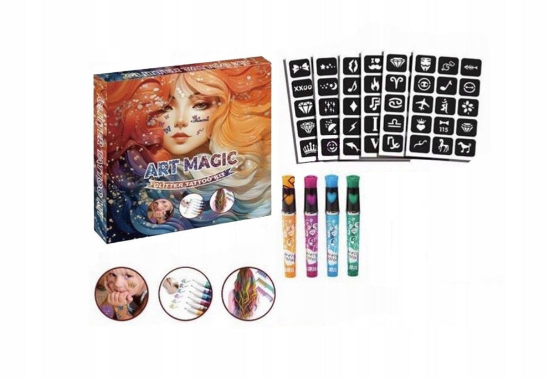 Zestaw do tatuażu ART MAGIC to kreatywna zabawa pełna blasku, koloru i radości. Dzięki łatwej aplikacji i bezpiecznym materiałom, dzieci mogą samodzielnie tworzyć wyjątkowe ozdoby na skórze – idealne na imprezy, urodziny, festyny lub codzienną zabawę w domu!