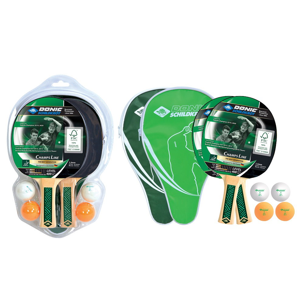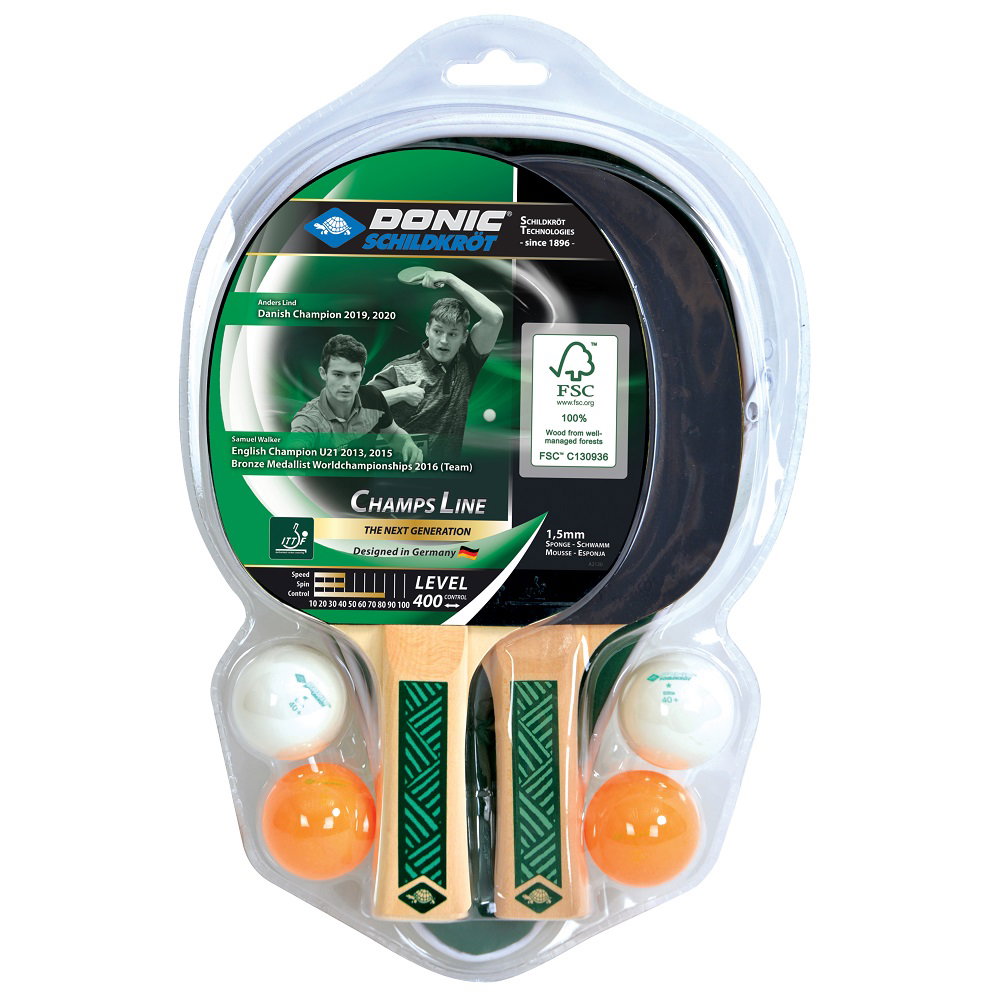 Zestaw do tenisa stołowego DONIC Young Champs 400 FSC - to wysokiej jakości, bardzo wszechstronnie wyposażony zestaw, nadający się do rekreacji i rozgrywek szkolnych. Opakowanie zawiera 2 rakiety poziomu 400 zatwierdzone przez ITTF. Pod gumą znajduje się gąbka o grubości 1,5 mm, która nadaje rakietce określone przyspieszenie, ale także wystarczającą kontrolę nad piłką do gry rekreacyjnej. W przypadku tej rakiety nacisk położony jest wyraźnie na kontrolę nad piłką. Wklęsły uchwyt pewnie leży w dłoni. W zestawie znajdują się 2 osobne pokrowce na rakiety, dzięki czemu można transportować dwie rakiety oddzielnie. Zestaw zawiera również 4 wysokiej jakości piłki do tenisa stołowego Donic-Schildkröt, 40 mm, w nowej jakości (2 białe, 2 pomarańczowe). W zestawie Champs zastosowano teraz również drewno posiadające certyfikat FSCTM (Forest Stewarship CouncilTM).