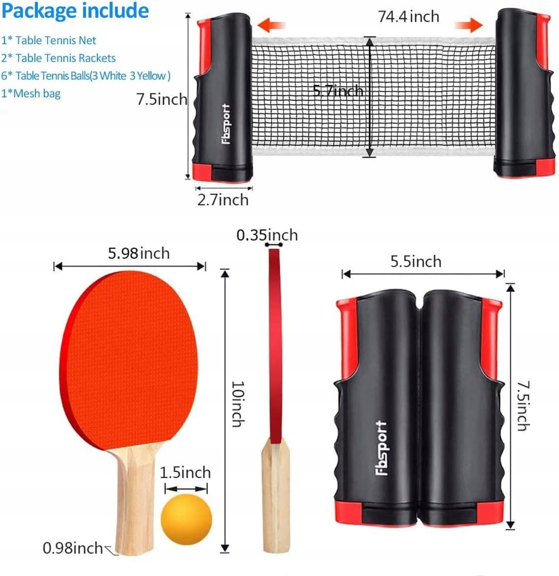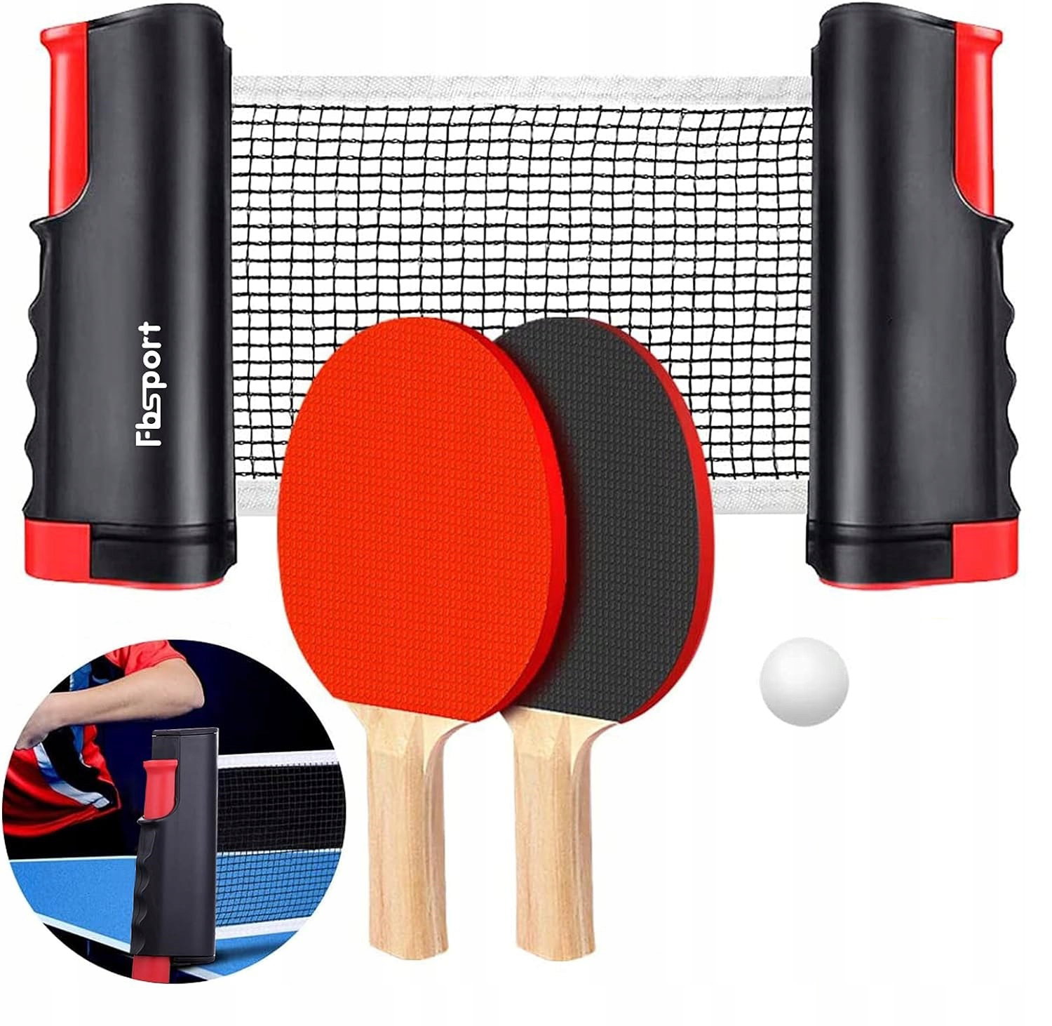 Kompletny zestaw do tenisa stołowego premium: Ten zestaw do tenisa stołowego zawiera 2 rakietki do tenisa stołowego, 5 piłeczke do tenisa stołowego, zwijaną siatkę do tenisa stołowego.