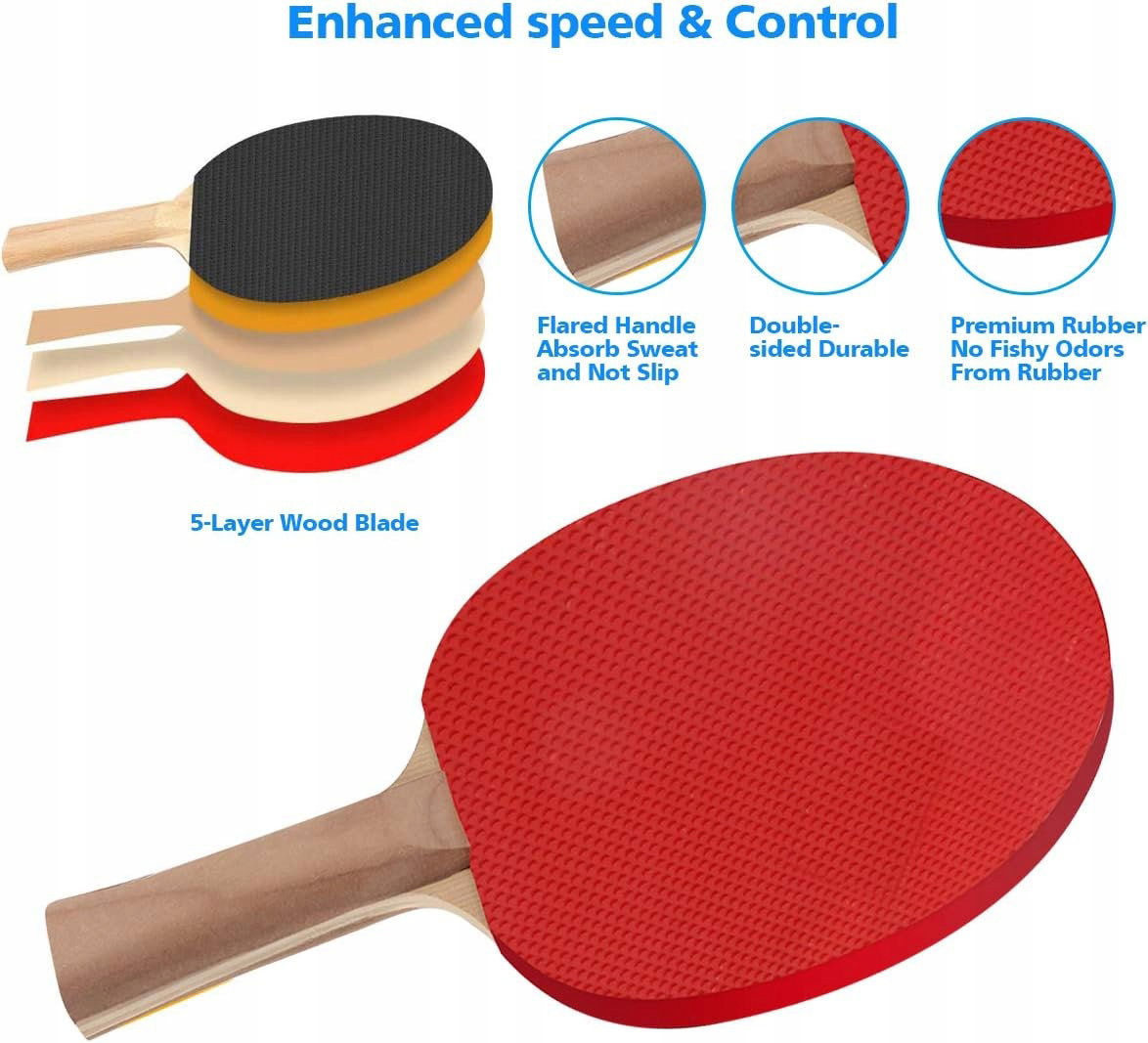 Profesjonalne rakietki i piłeczki do tenisa stołowego: rakietka do tenisa stołowego z ergonomicznym, wysuwanym uchwytem zapewnia wygodny chwyt podczas długich sesji i dobre wchłanianie potu, co zapewnia doskonałą kontrolę i rotację. Te bezszwowe piłeczki zostały zaprojektowane tak, aby zapewnić niezawodną trwałość i wytrzymałość.