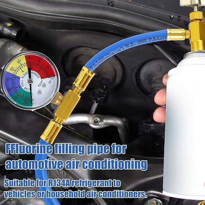 SZEROKIE ZASTOSOWANIE — Wąż do napełniania klimatyzacji samochodowej z manometrem, pasuje do czynnika chłodniczego R134A w pojazdach lub domowych klimatyzatorach.