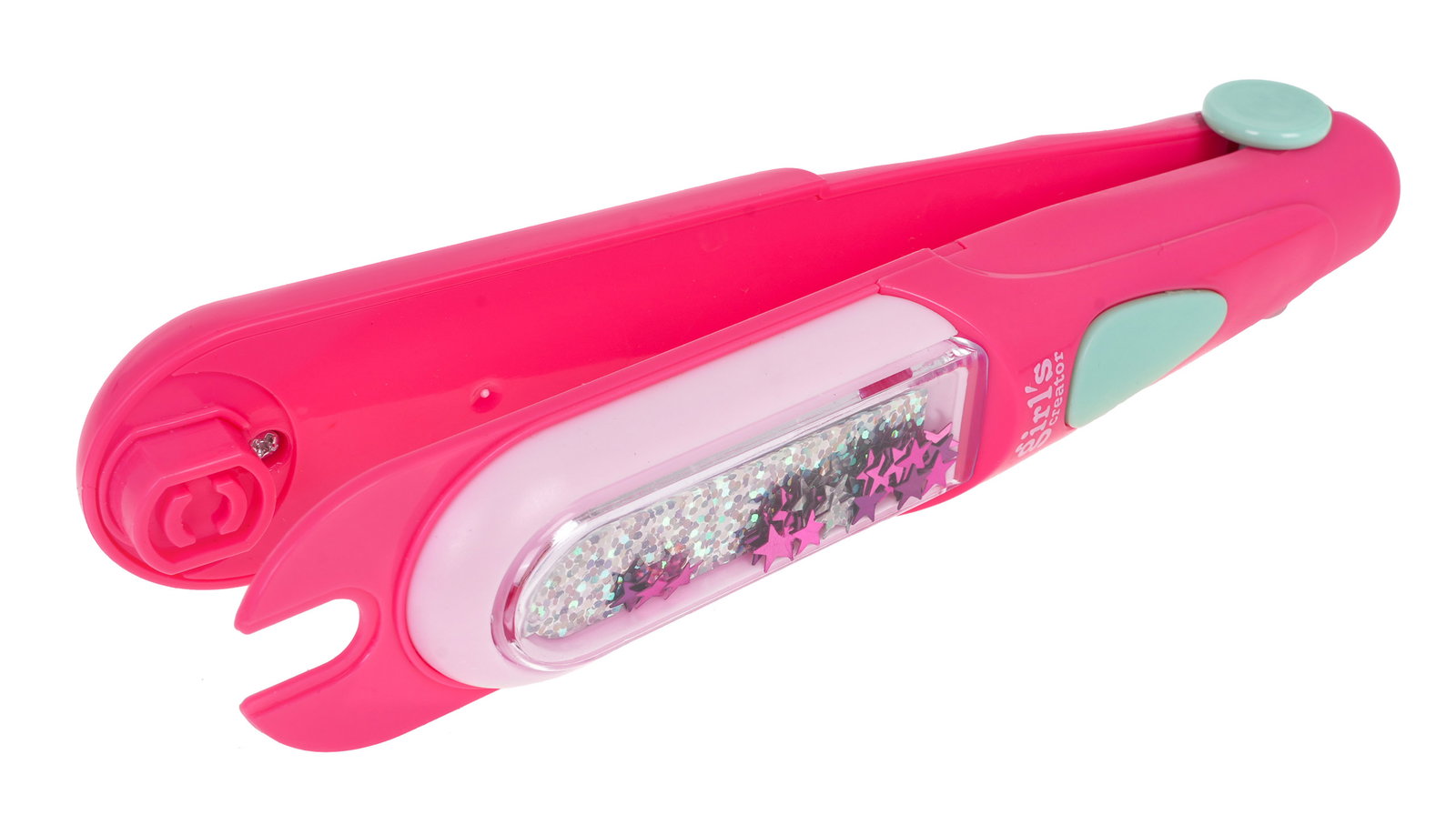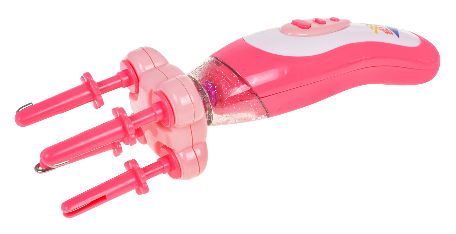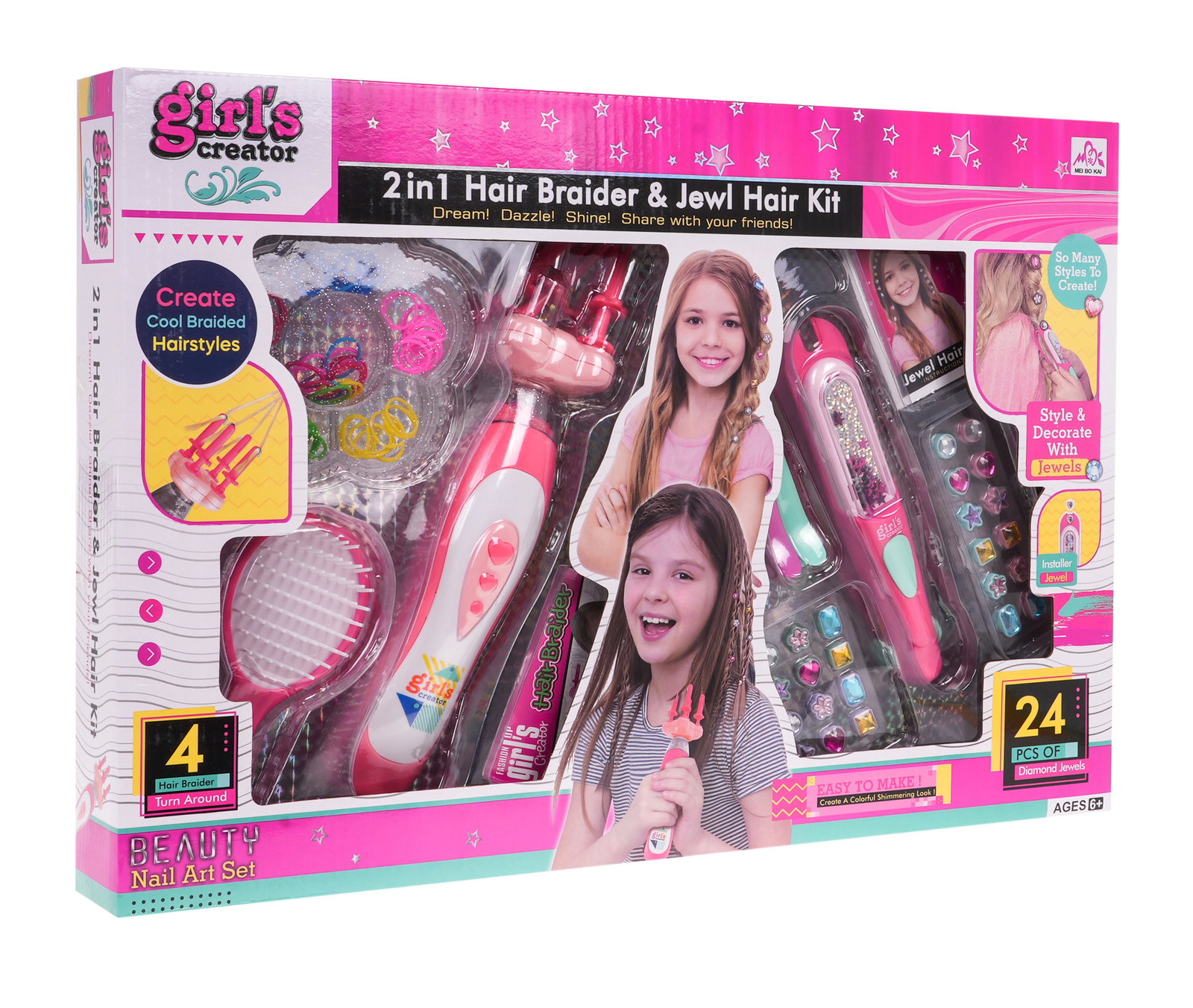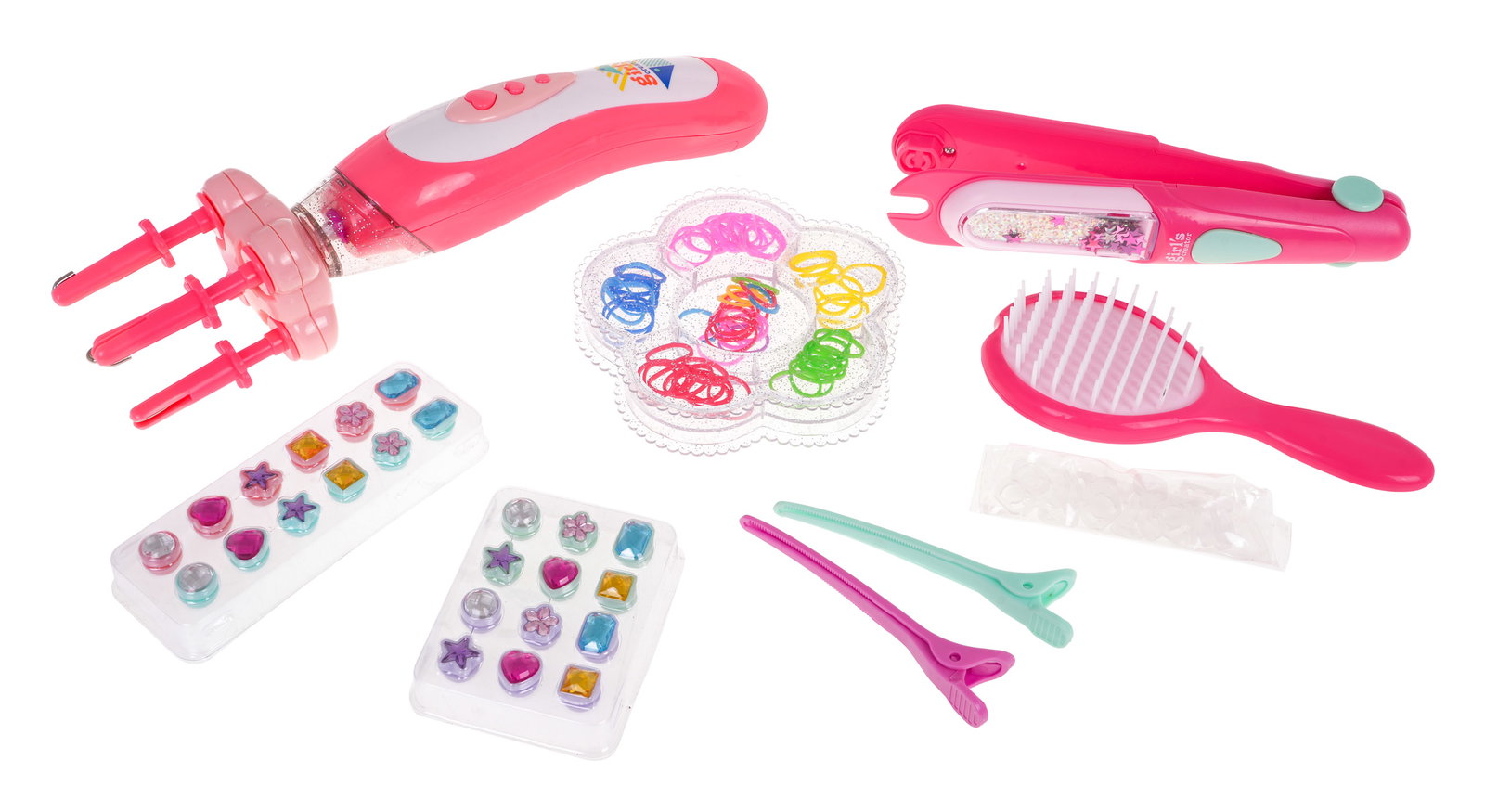 Bogato wyposażony zestaw z maszynką do zaplatania włosów w warkocze i maszynką do aplikacji biżuterii na włosach, to propozycja dla dzieci od 6-go roku życia. Zestaw składa się z 24 elementów. Jest tutaj maszynka do zaplatania włosów w warkocze i maszynka do aplikacji koralików na włosach, oraz szczotka do włosów, diamenciki i gumki do włosów. Maszynka do zaplatania warkoczy zasilana jest bateriami typu 2 x AA 1,5 V, baterii brak w zestawie. Użycie maszynki jest bardzo proste, wystarczy włożyć 3 pasma włosów do otworów w bolcach i przesunąć przycisk z diamentem w górę. Gotowe! Maszynka do aplikacji koralików na włosy wyglądem przypomina prostownicę. Nie jest zasilana na baterie. Aby nanieść aplikację na włosy, należy na górnej części maszynki umieścić biżuterię a na dolnej spinkę. Następnie wkładamy pasmo włosów do maszynki i dociskamy. Gotowe!! Aplikacje i spinki są wielorazowe.