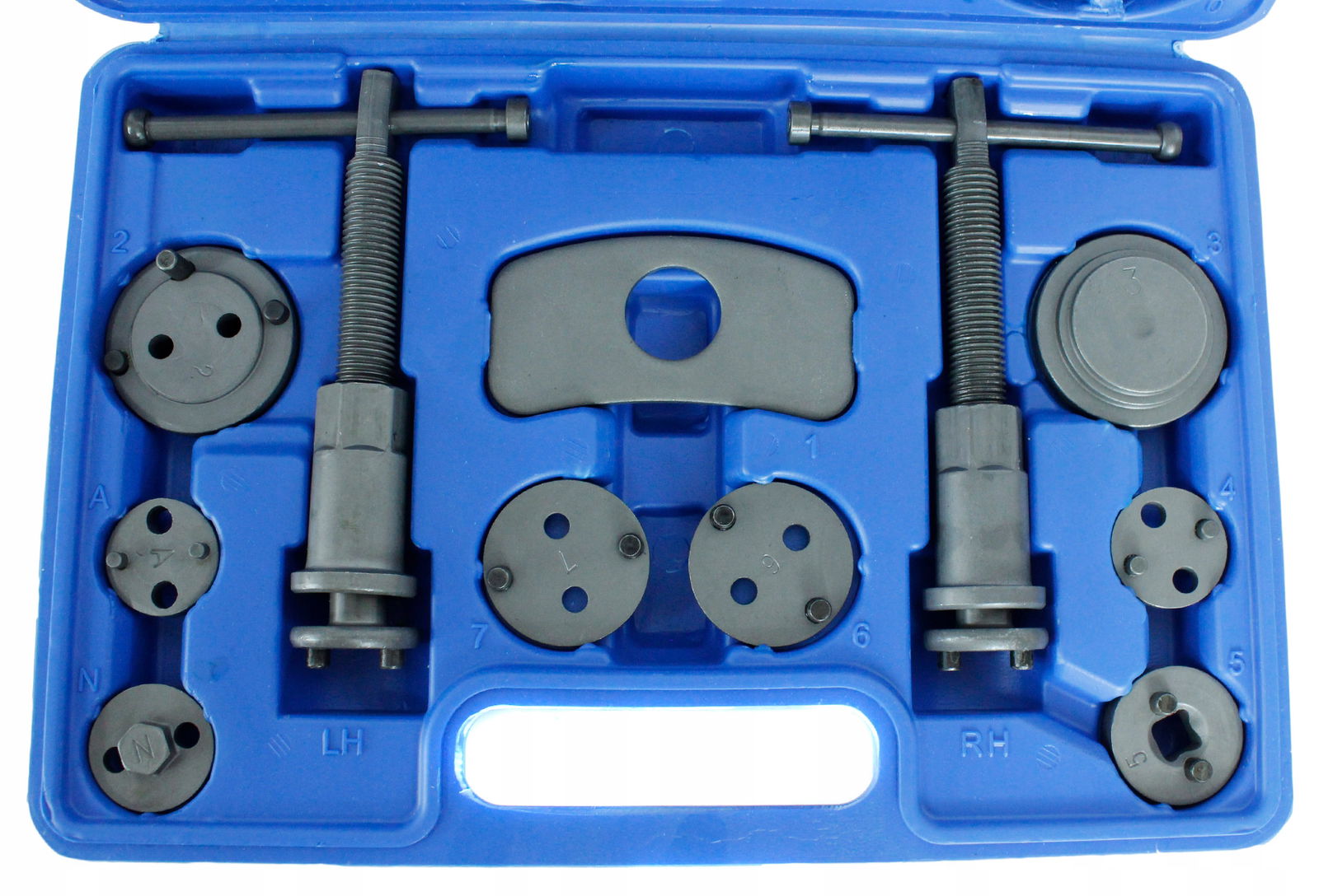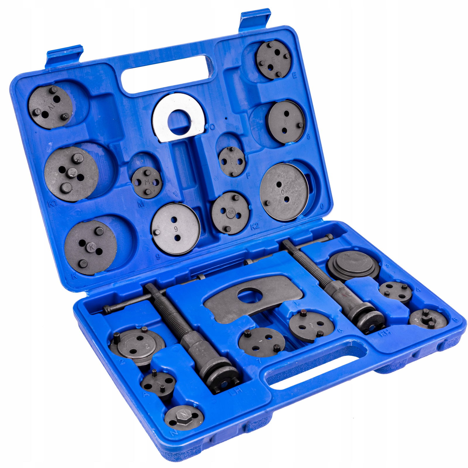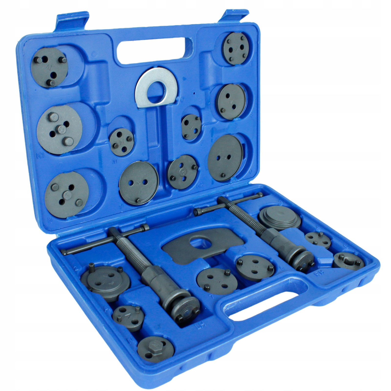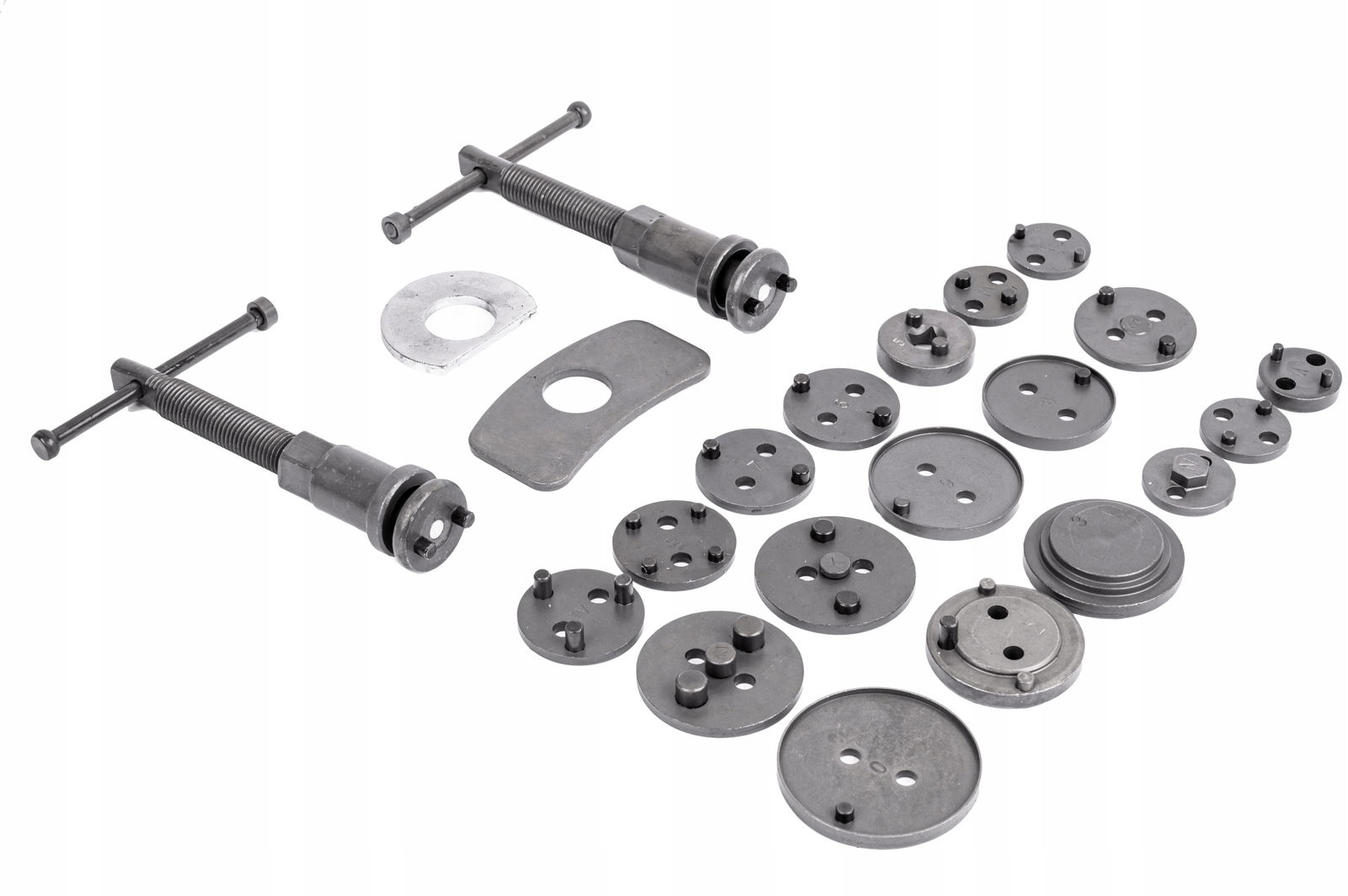 - W zestawie znajdują się dwie prasy (prawo i lewo skrętna), dwie różnego kształtu belki do zapierania prasy o siodło zacisku oraz 17 adapterów dostosowanych do wielkości tłoczków hamulcowych stosowanych w większości samochodów osobowych produkowanych na rynku europejskim oraz azjatyckim.
