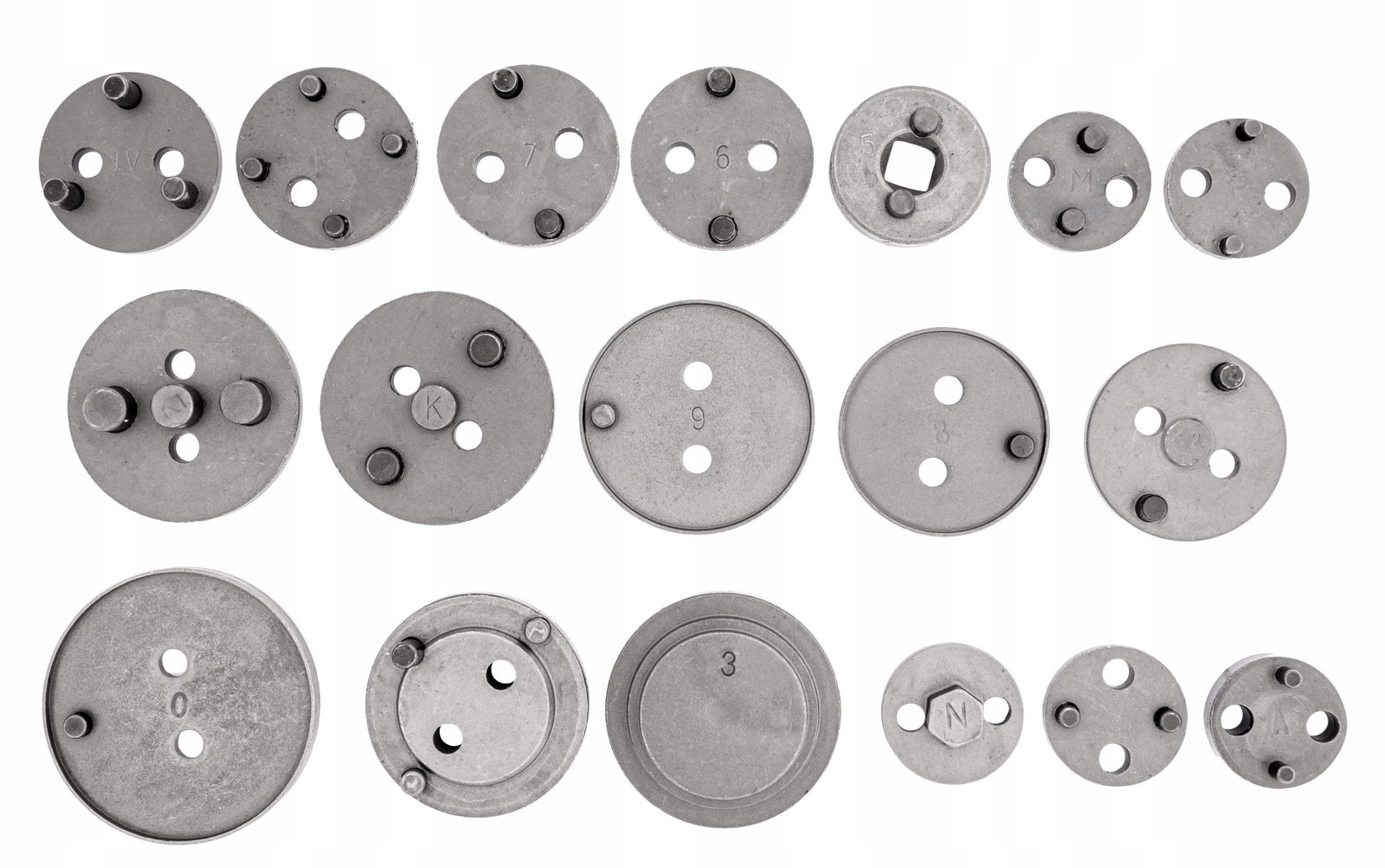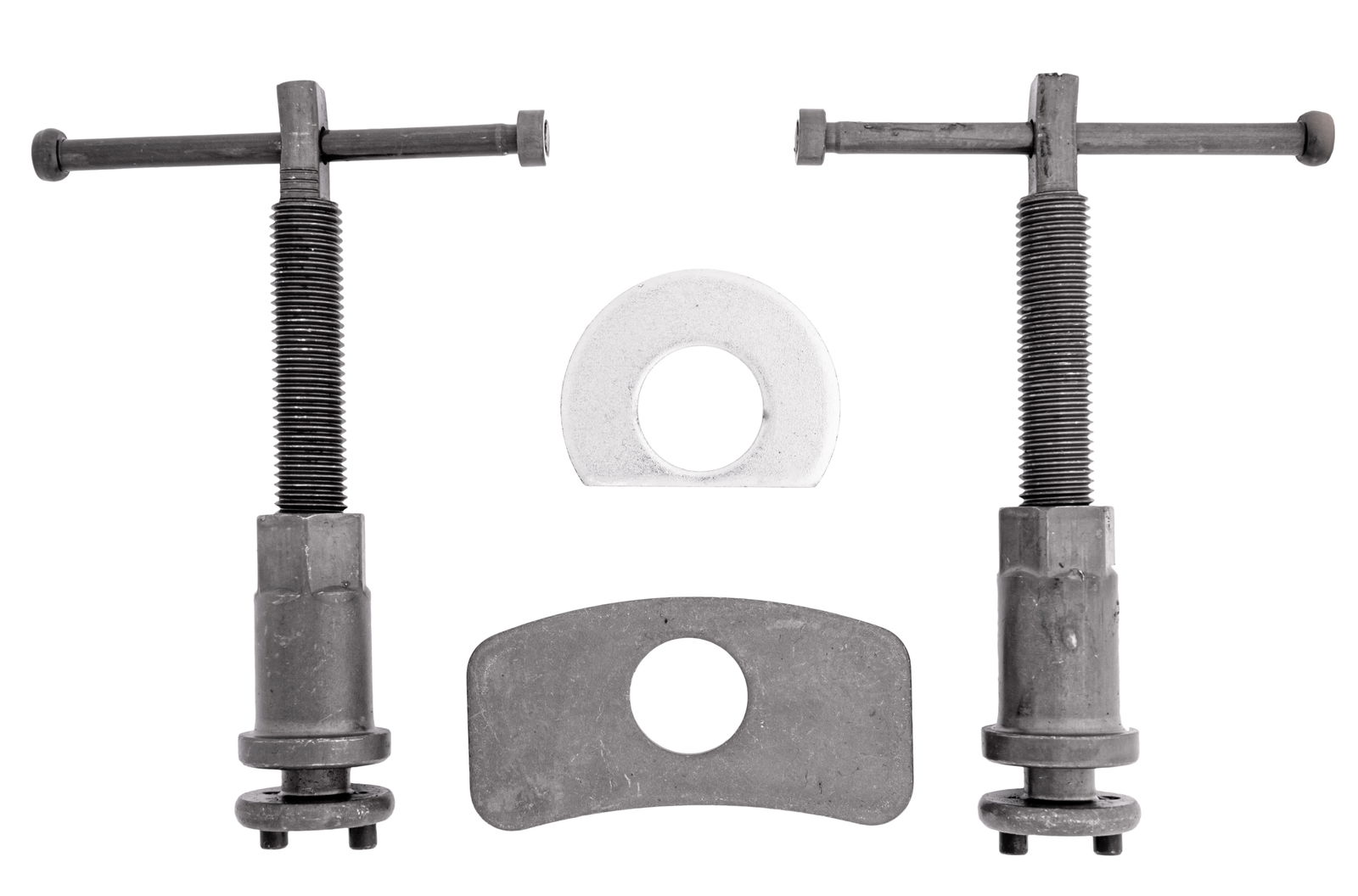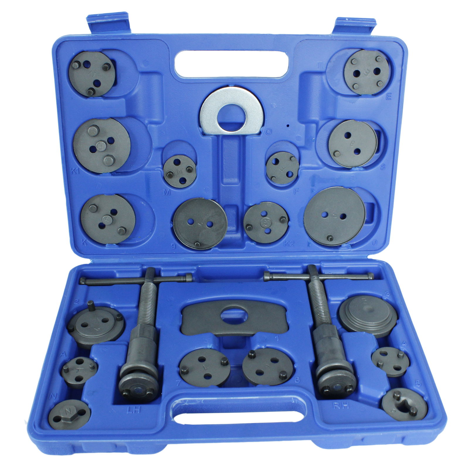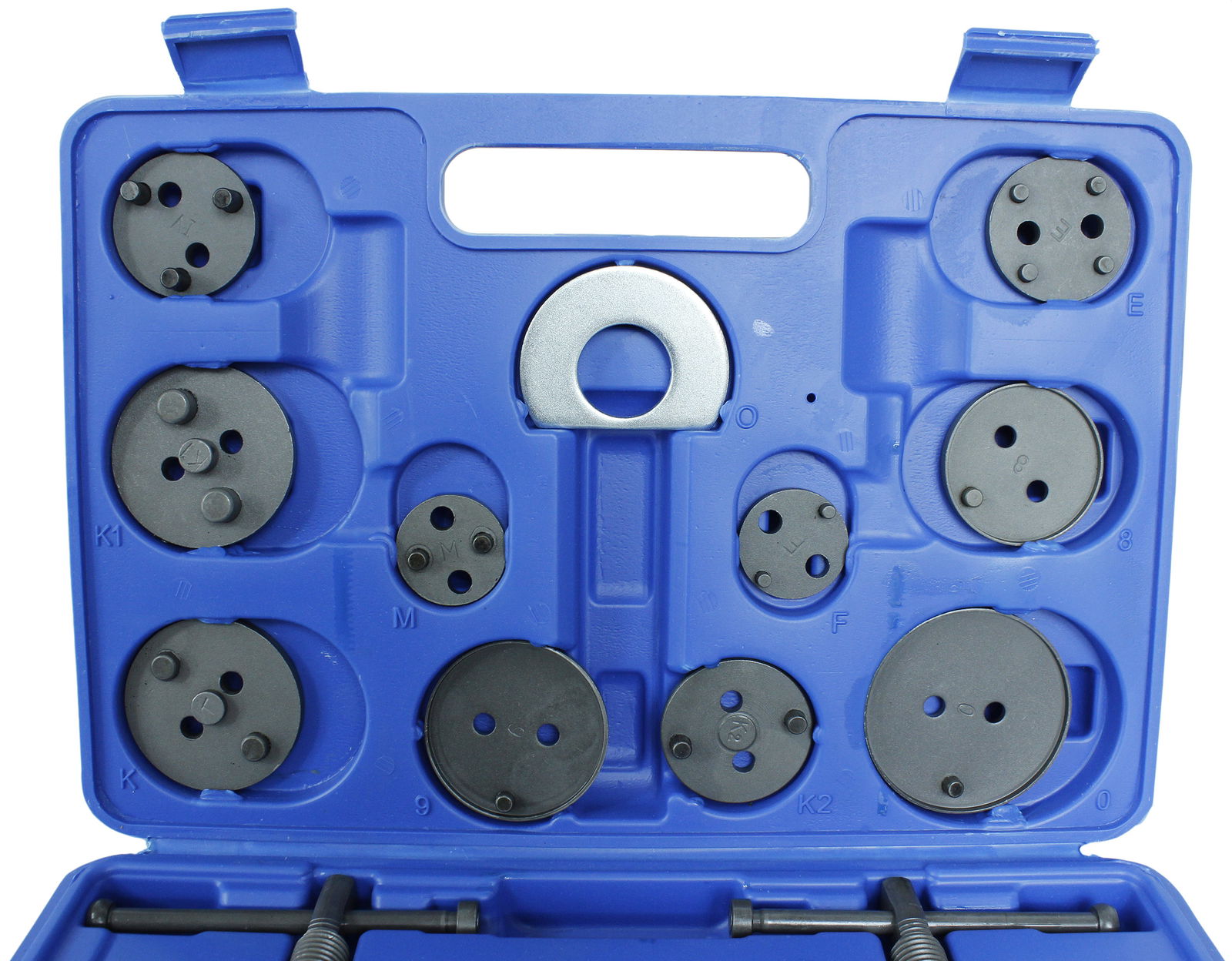 - W zestawie znajdują się dwie prasy (prawo i lewo skrętna), dwie różnego kształtu belki do zapierania prasy o siodło zacisku oraz 17 adapterów dostosowanych do wielkości tłoczków hamulcowych stosowanych w większości samochodów osobowych produkowanych na rynku europejskim oraz azjatyckim.