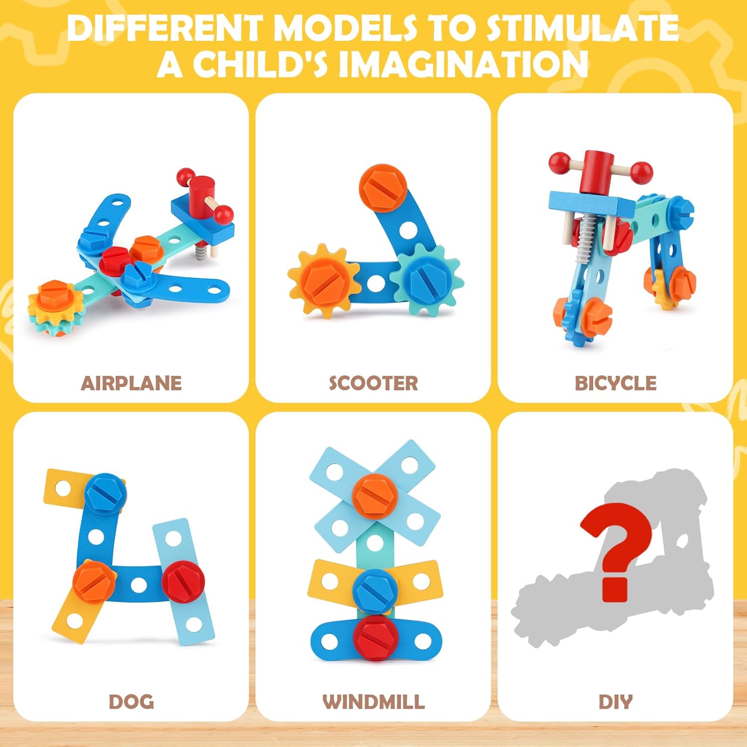 - Bogaty Zestaw Narzędzi i Akcesoriów: W skład zestawu wchodzą realistyczne, drewniane odpowiedniki narzędzi, takich jak młotek i klucz francuski, a także mnóstwo kolorowych śrub, nakrętek, podkładek i elementów konstrukcyjnych. Dzięki nim mały majsterkowicz może skręcać, rozkręcać i budować niemal nieskończoną ilość konstrukcji.