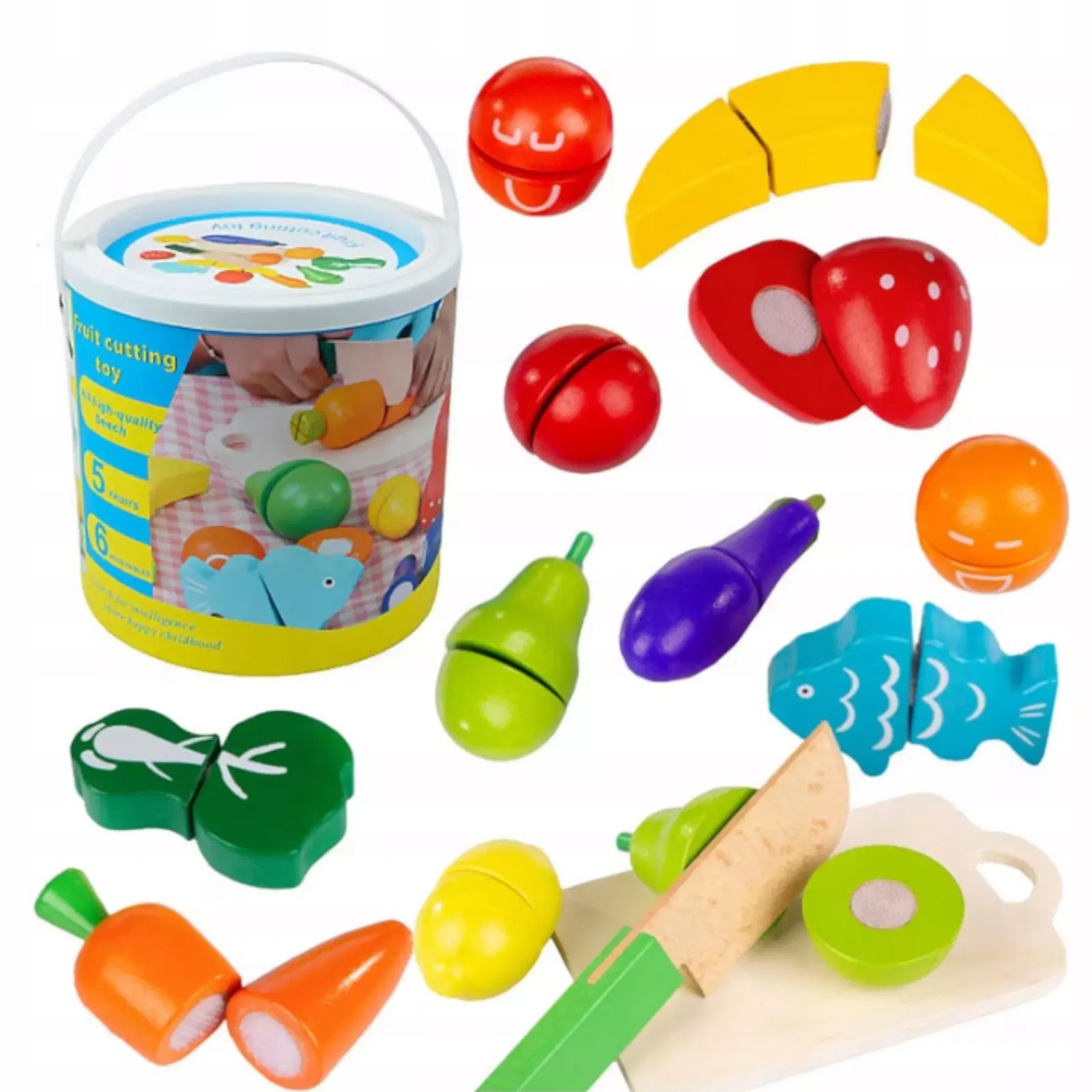 Idealna propozycja dla dzieci powyżej 3 lat - zestaw drewnianych owoców i warzyw do krojenia. Wykonane z naturalnego drewna, pomalowane nietoksyczną farbą, rozwijają zdolności manualne i wyobraźnię maluchów. Zestaw zawiera drewnianą deskę, nóż, 6 owoców (banan, gruszka, truskawka, pomarańcza, mandarynka, cytryna), 4 warzywa (marchewka, bakłażan, brokuł, pomidor) oraz drewnianą rybkę. Realistyczna zabawa stymuluje zmysły i uczy nazw, promując zdrowe odżywianie. Solidne wykonanie, atrakcyjne kolory i pełen zestaw akcesoriów zapewniają długie godziny kreatywnej zabawy. Nie tylko bawi, ale także wspomaga rozwój motoryki małej i wyobraźni dziecka.
