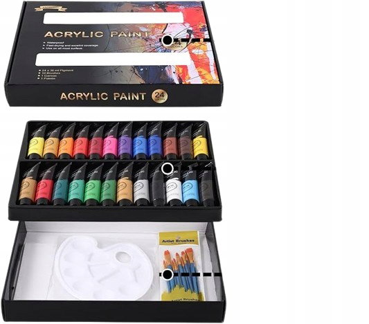 - Zawartość zestawu: 24 tubki farb akrylowych (36 ml każda), 10 pędzli, 1 paleta, 1 płótno