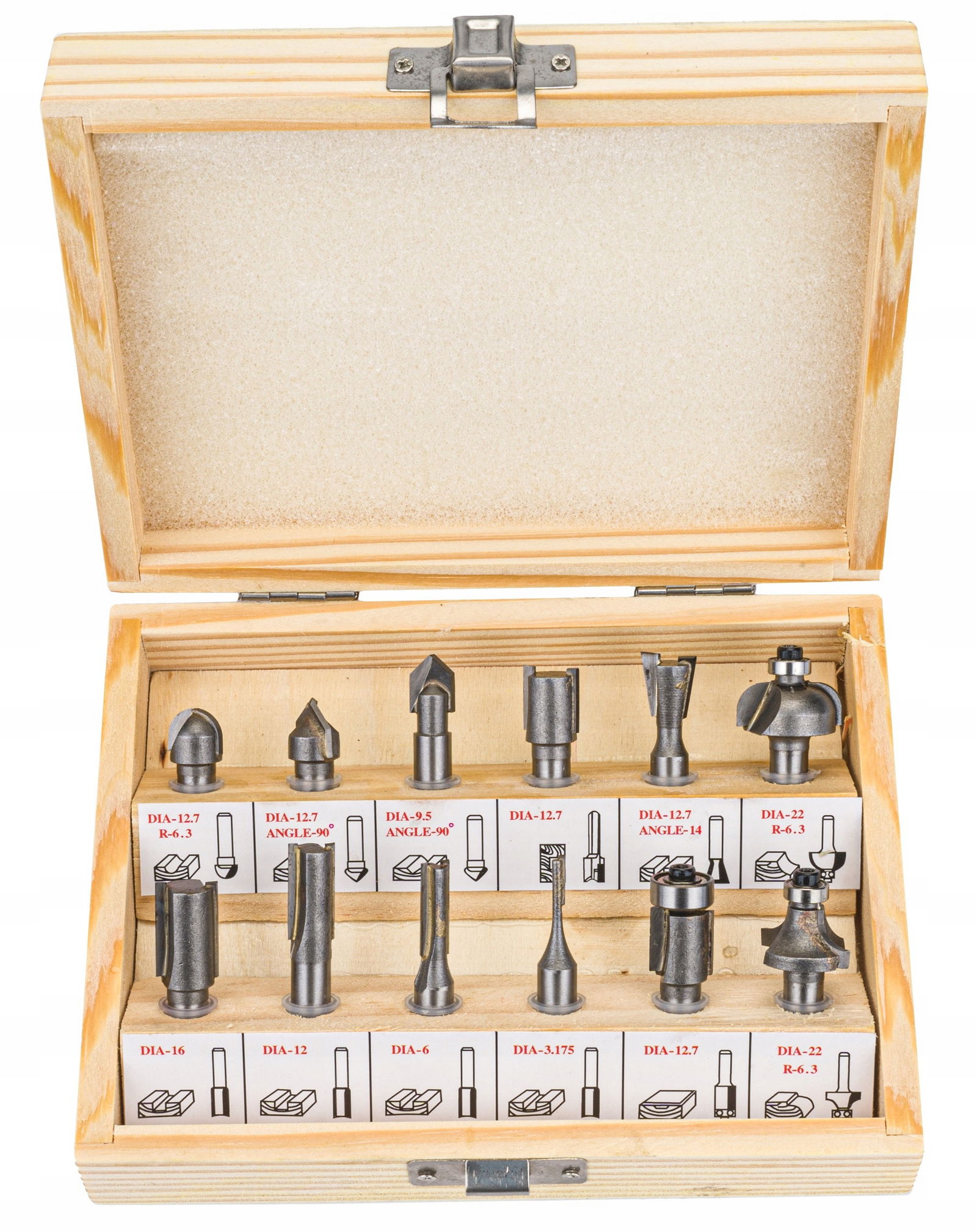 ZESTAW 12 FREZÓW DO DREWNA W DREWNIANEJ WALIZCE M22549