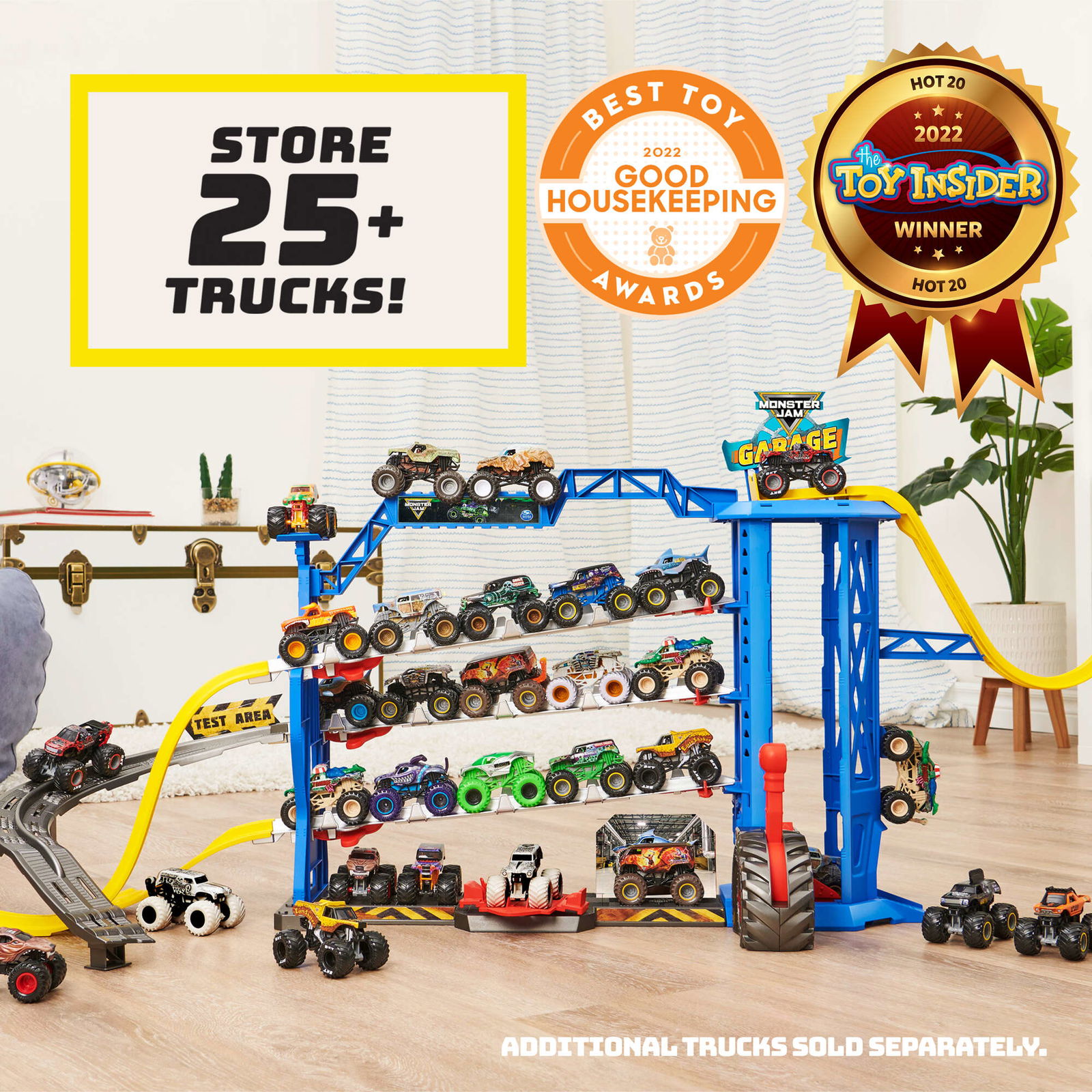 Monster Jam Garage jest przeznaczony dla fanów serii szukających odpowiedniego miejsca do przechowywania swoich pojazdów. Zestaw ten pozwoli także na świetną zabawę z wieloma atrakcjami, takimi jak tor, miejsce parkingowe dla ponad 25 pojazdów, efekty świetlne i dźwiękowe, stacja tankowania oraz winda.