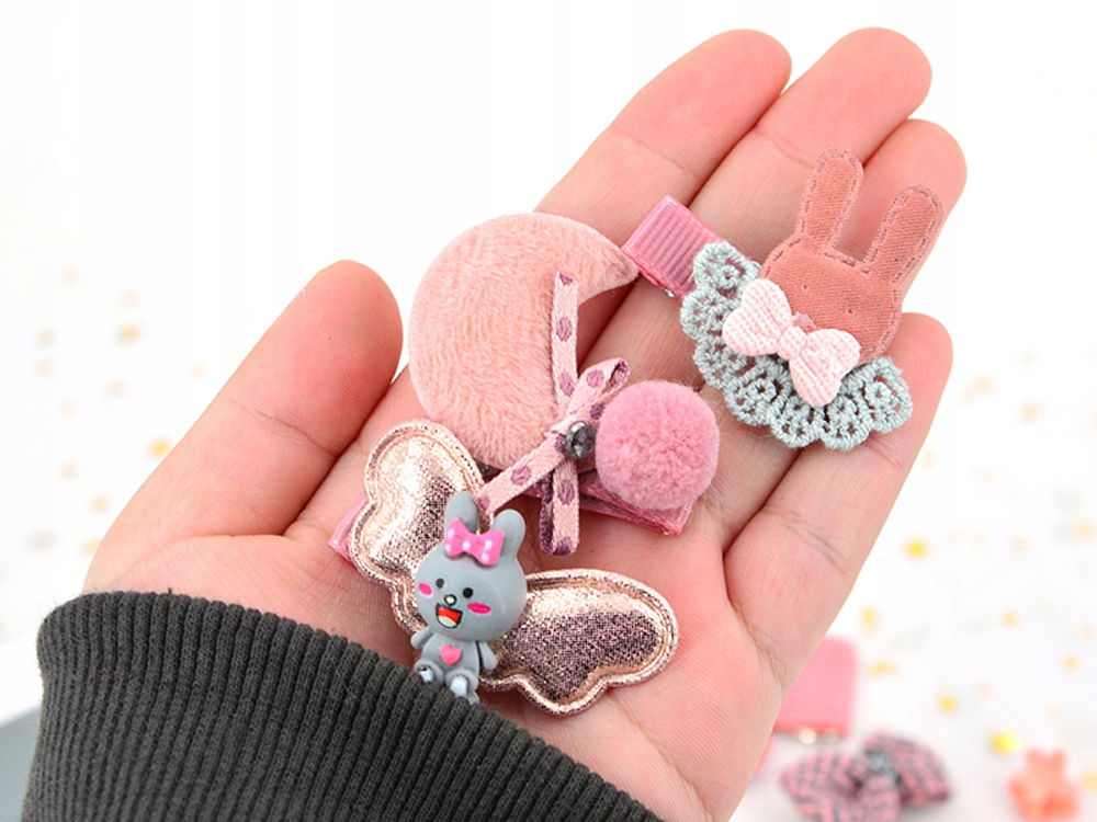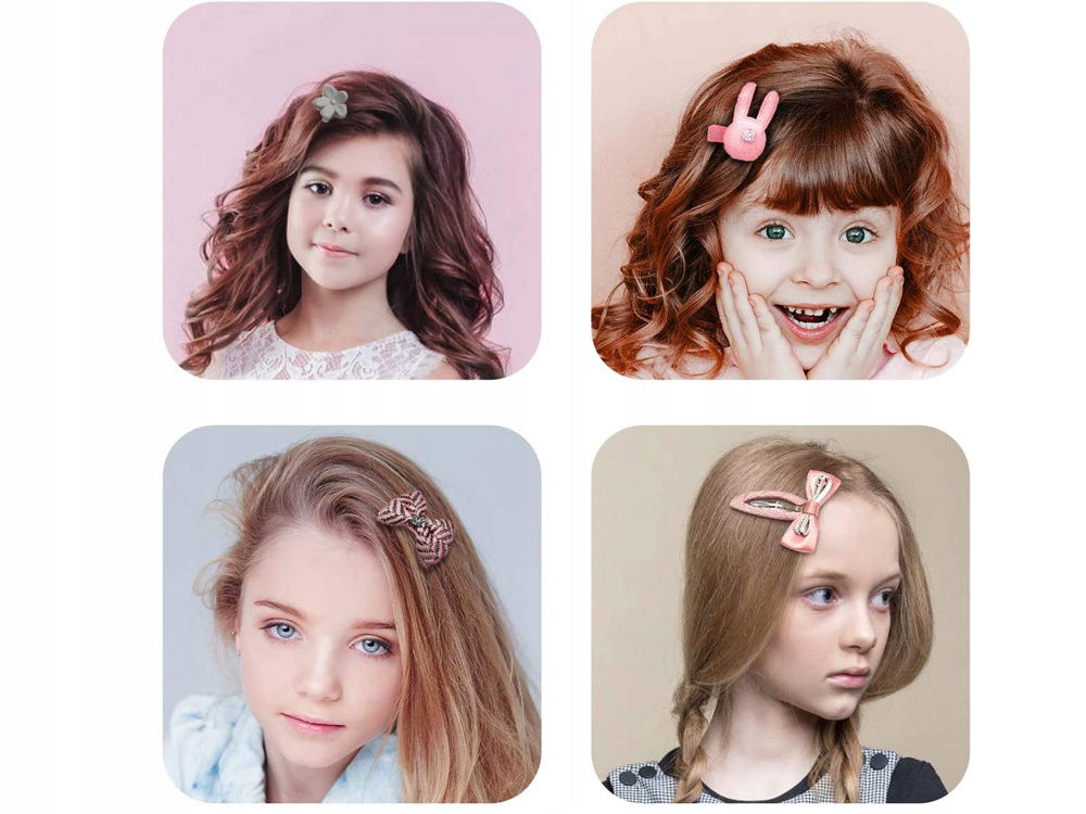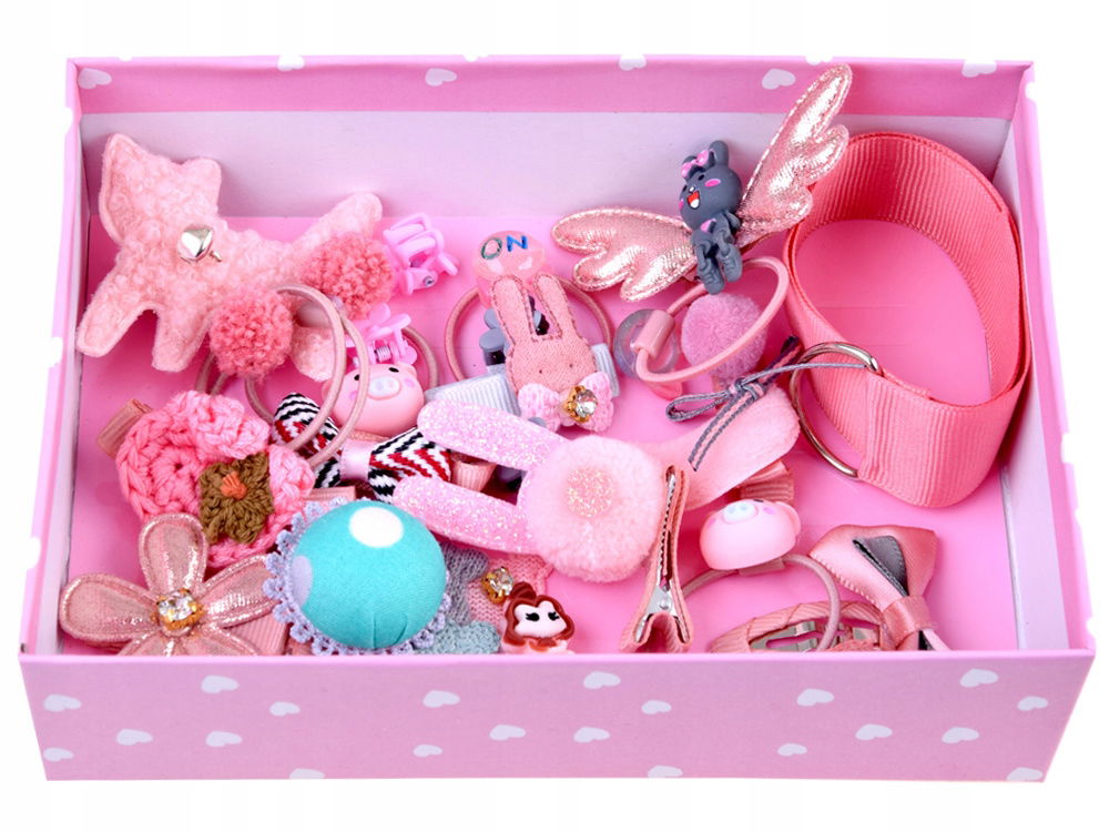 Uroczy zestaw akcesoriów do stylizacji fryzur dla dziewczynki w postaci spinek i gumek do włosów, sprawdzi się podczas nie jednej stylizacji.
